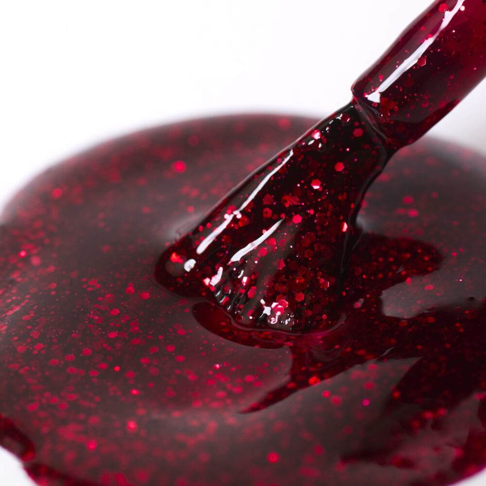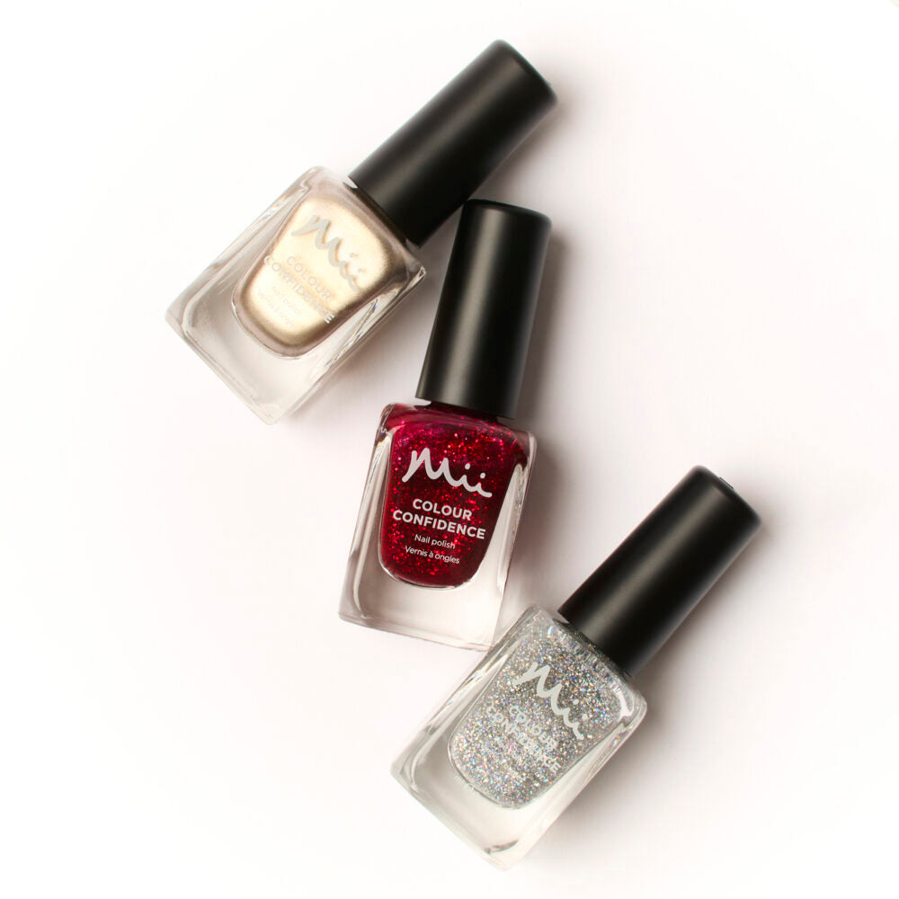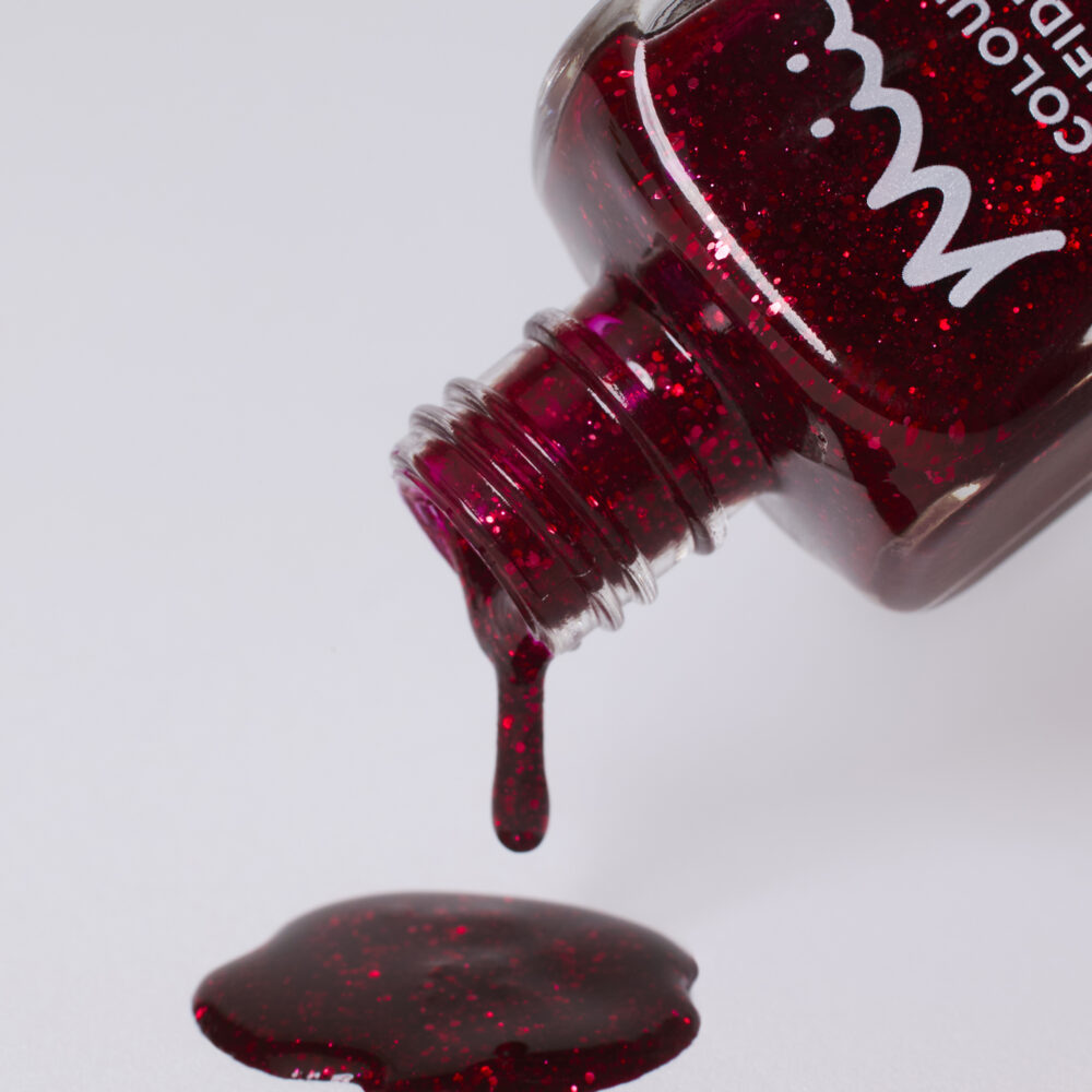 Glittery cherry red nail polish. Mii believes in the language of colour – pick your shade, tell your story. Mii's super shiny, fast drying Colour Confidence Nail Polish delivers reliable colour quality and durable wear for outstanding results. Each drop is enriched with a high performance vitamin complex to nurture nails as you wear, including nourishing Vitamin C, strengthening Vitamin A and Vitamin E to protect from peeling and yellowing. The pro-glide brush expertly navigates the nail plate for painting precision.