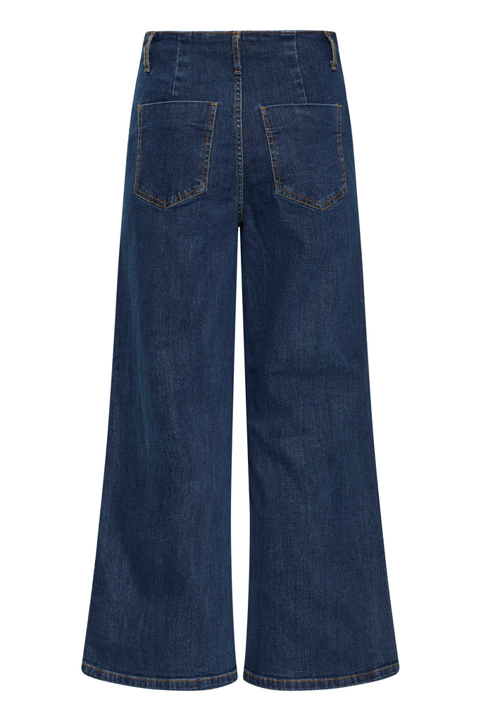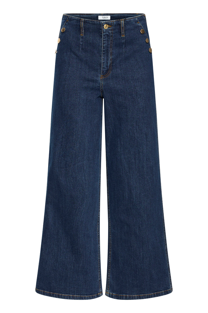 Embrace a retro 60s vibe with The Komma Button Jeans in dark blue denim. Featuring flattering wide legs and striking gold buttons down the side, these jeans combine vintage charm with a modern, trending silhouette. Perfect as a staple piece in your winter wardrobe, they effortlessly elevate any outfit with timeless style and bold detail.