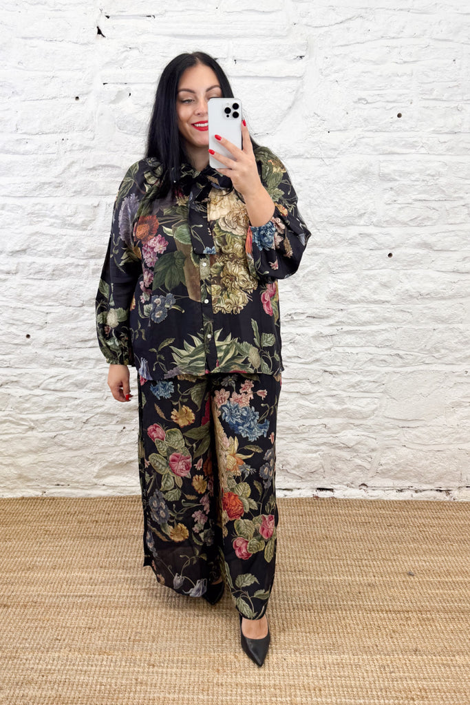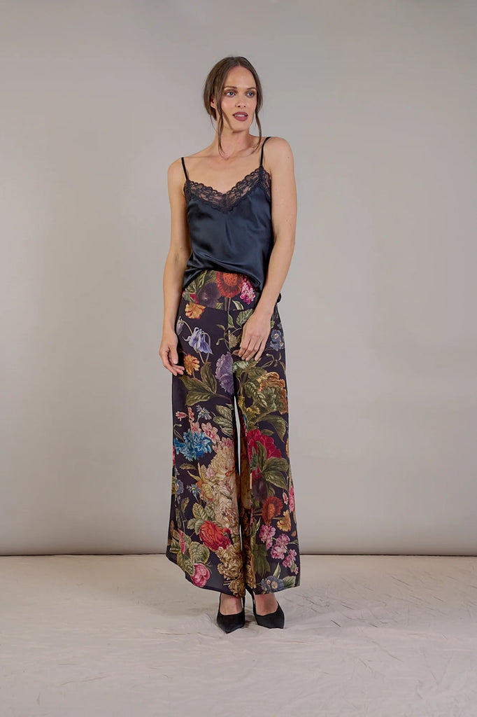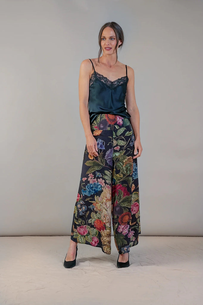 Inspired by the artistry of Dutch Old Masters, this design showcases a vibrant array of primroses, auriculas, and polyanthus blossoms in rich, striking hues. The intricate print captures exquisite detail, making it a classic piece in the One Hundred Stars collection. These elegant crepe palazzo trousers offer a fluid, wide-leg silhouette ideal for both lounging and stylish outings. Combine them with a matching blouse for a coordinated ensemble or a simple camisole for graceful, effortless charm.