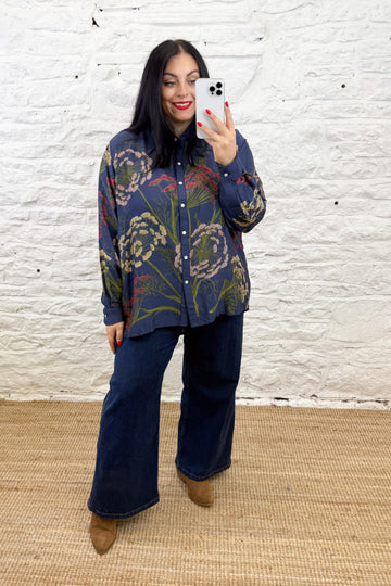 Drawing inspiration from a towering cow parsley on the verge of seeding, this shirt blends pink, rust, and camel floral tones against a deep midnight blue backdrop. Designed for both work and weekend wear, it features dropped shoulders, a dipped hemline, and delicate mother of pearl buttons. The longline silhouette offers a graceful flow and an effortlessly chic style, ideal for any season.