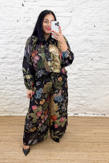 Inspired by the artistry of Dutch Old Masters, this design showcases a vibrant array of primroses, auriculas, and polyanthus blossoms in rich, striking hues. The intricate print captures exquisite detail, making it a classic piece in the One Hundred Stars collection. These elegant crepe palazzo trousers offer a fluid, wide-leg silhouette ideal for both lounging and stylish outings. Combine them with a matching blouse for a coordinated ensemble or a simple camisole for graceful, effortless charm.
