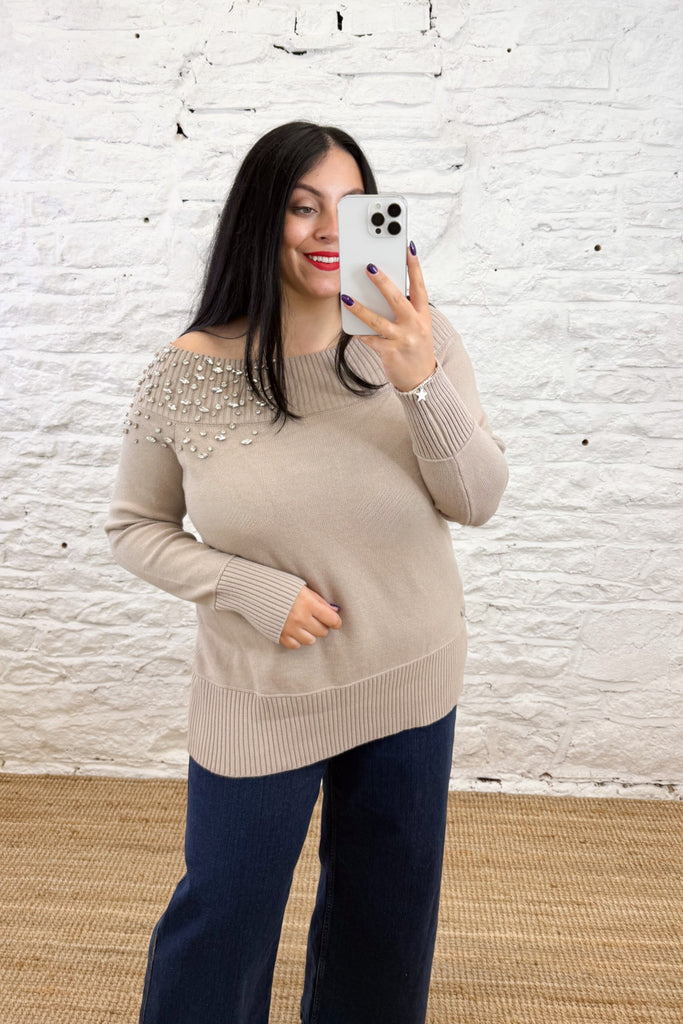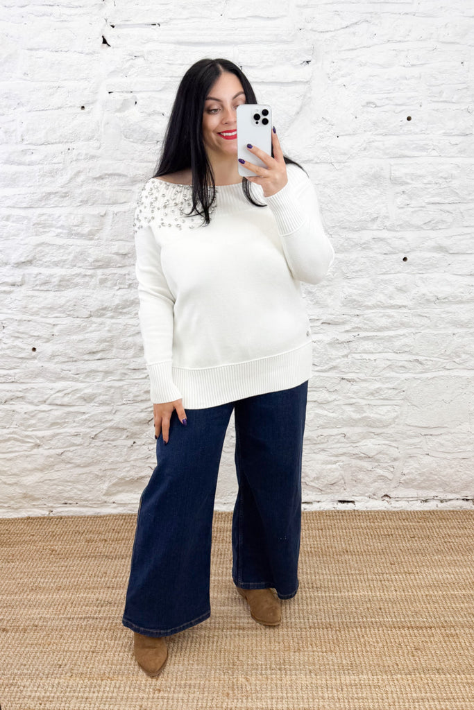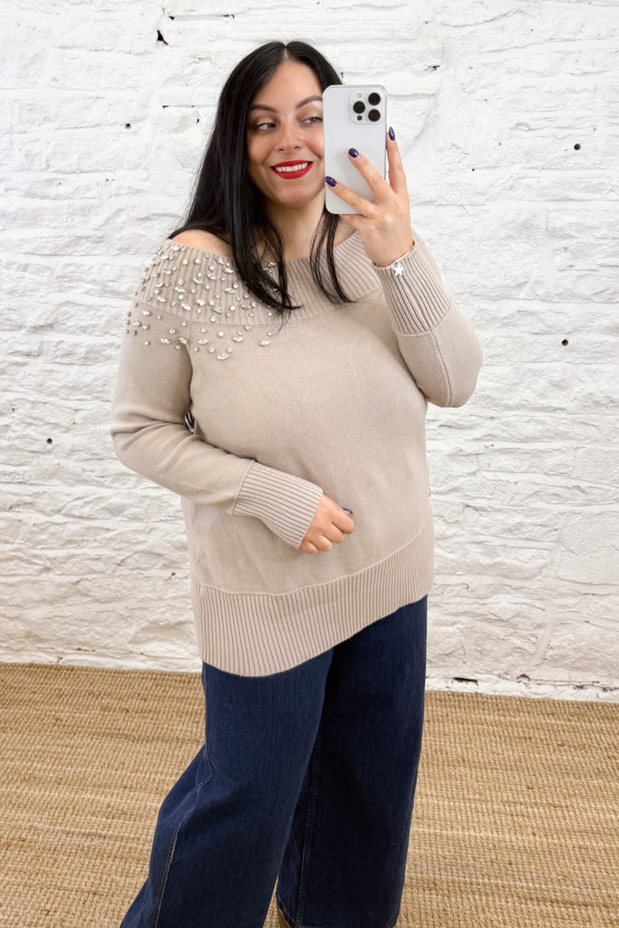 The Sherry Bardot Crystal Detail Jumper effortlessly blends elegance with a touch of sparkle. Featuring a flattering Bardot neckline that beautifully frames the shoulders, this jumper is elevated by delicate crystal embellishments for a refined, glamorous finish. Perfect for dressing up or adding sophistication to everyday looks, it’s a versatile statement piece that enhances your style with subtle shimmer and timeless charm.