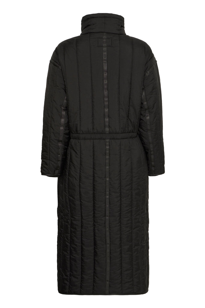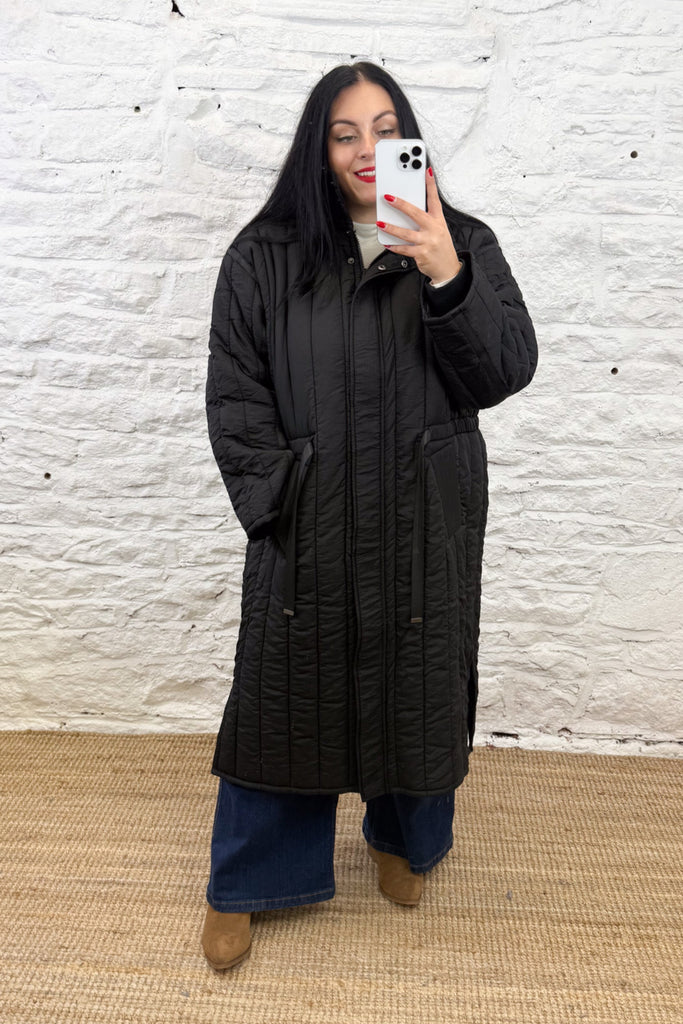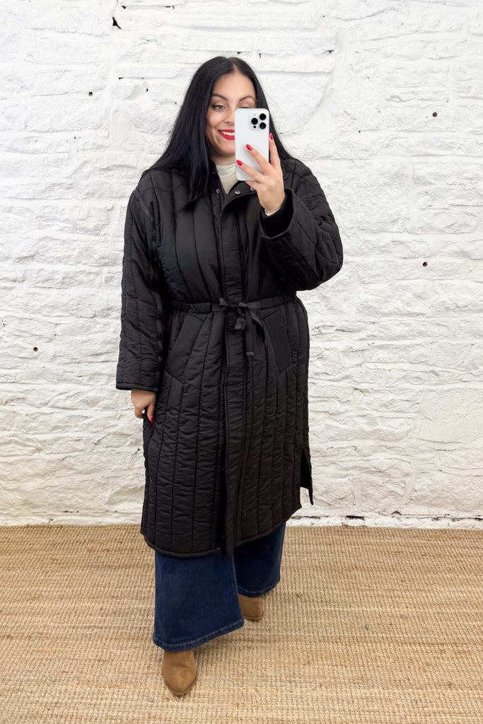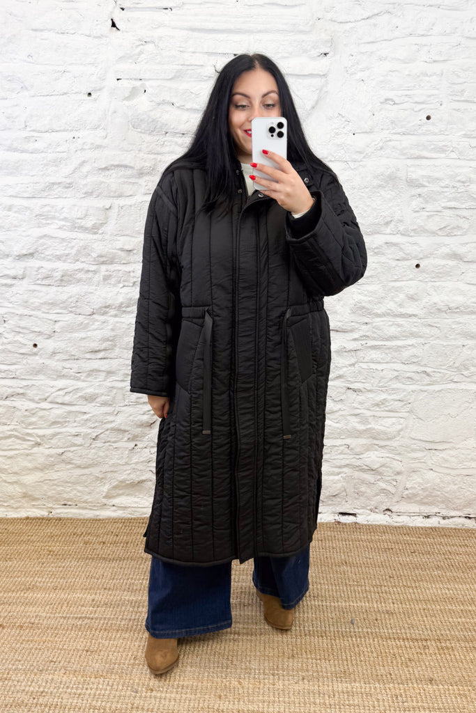 Stay effortlessly chic and warm with The Elvita Coat in black. This quilted longline jacket features a sleek zip-up front and practical pockets, combining timeless style with cosy comfort. Perfect for layering, it adds a polished touch to any outfit while keeping you snug on cooler days.