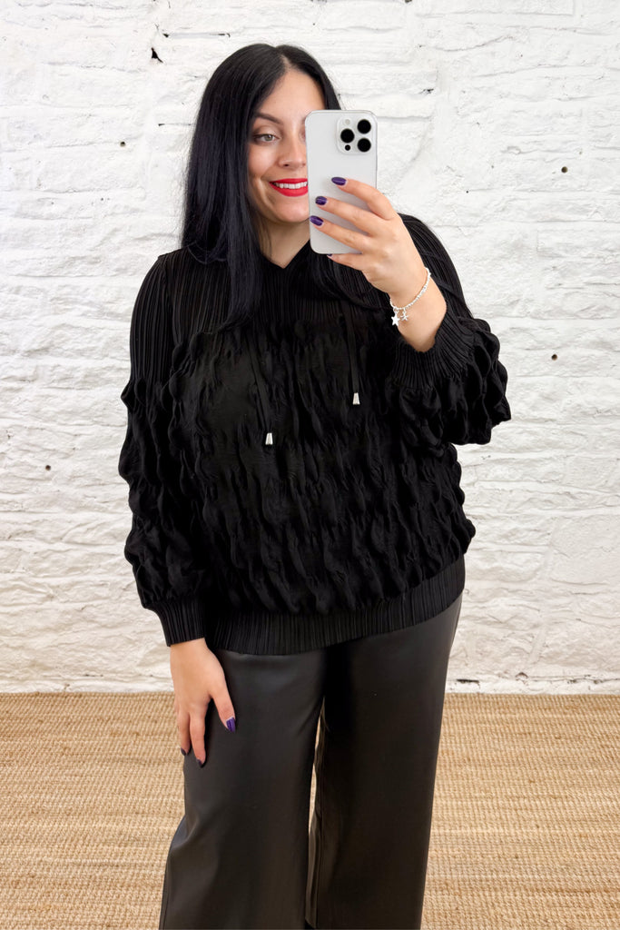 Elevate your casual wardrobe with The Lane Hooded Bubble Top, featuring a distinctive bubble design that adds a contemporary edge to classic long sleeves. The attached hood offers a laid-back yet stylish vibe, perfect for layering or wearing solo. Crafted to balance comfort and modern silhouette, this top brings effortless charm to your everyday looks.