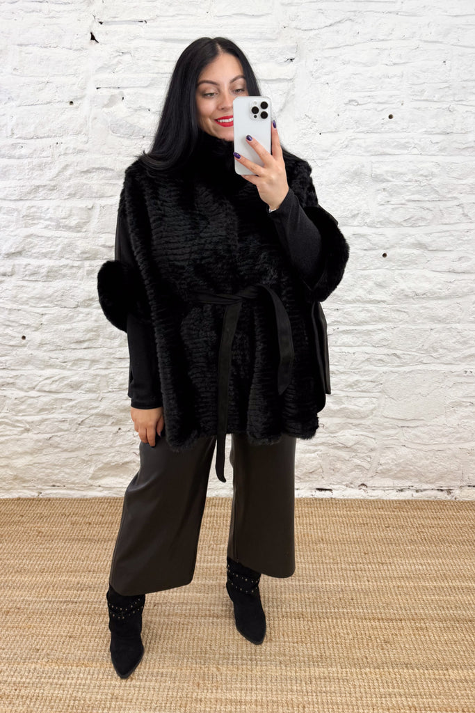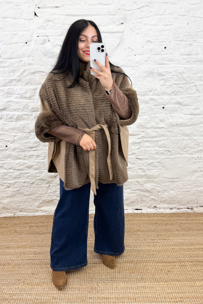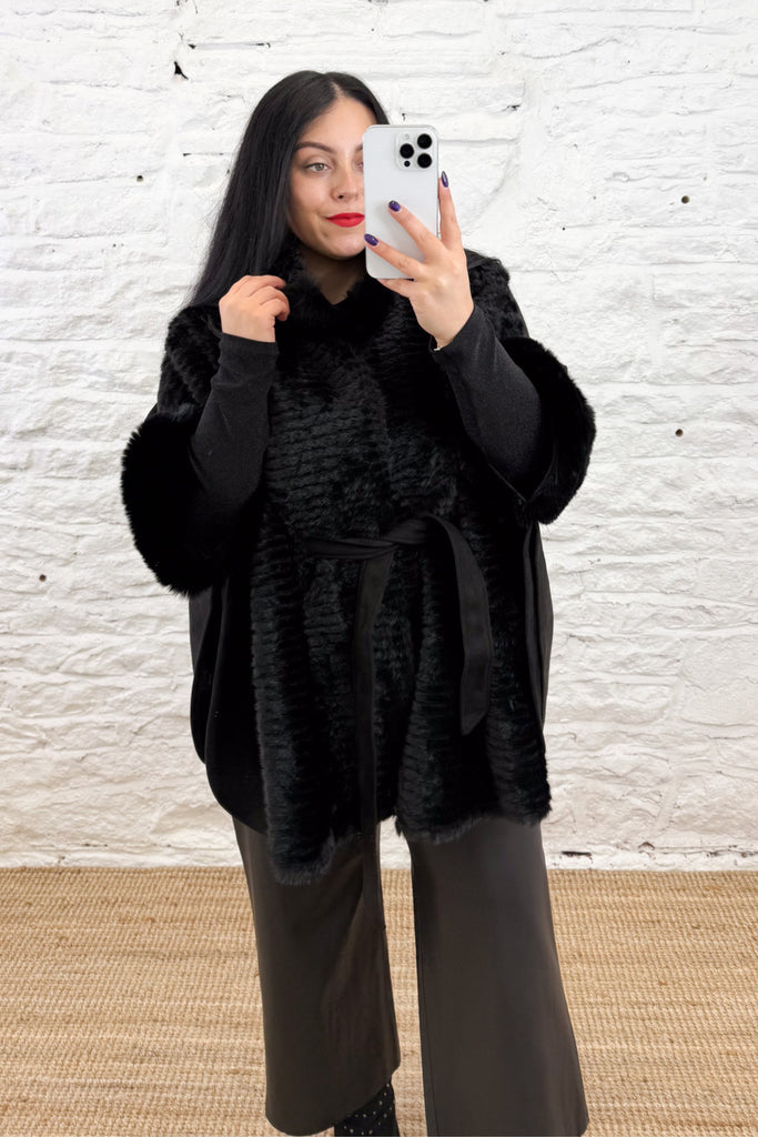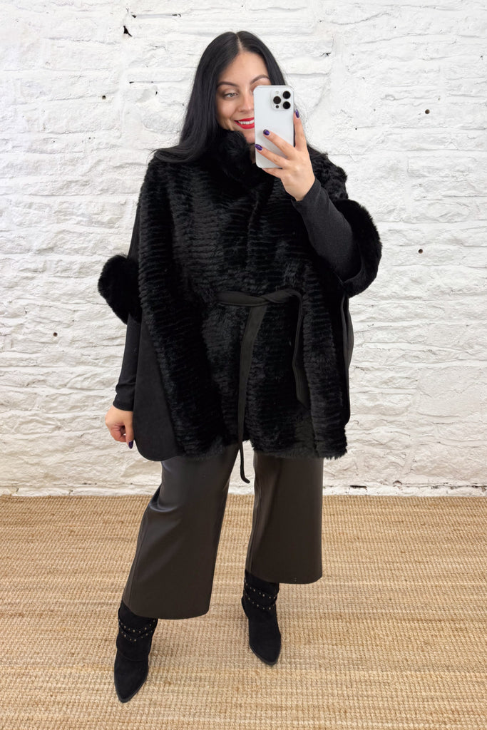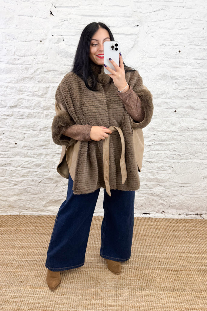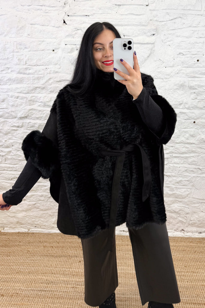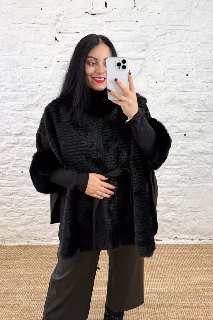 Elevate your outerwear with The Noor Belted Faux Fur Cape, featuring a plush ribbed faux fur front that adds texture and warmth. Its tailored belted waist defines your silhouette effortlessly, blending cosy comfort with chic sophistication. Perfect for layering over any outfit, this cape offers both style and versatility for a polished, fashion-forward look.