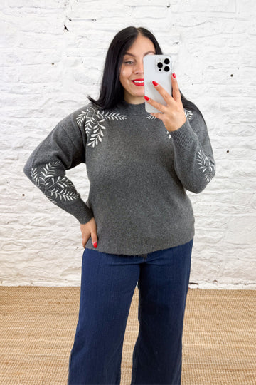 Elevate your wardrobe with The Maggie Jumper in Dark Grey, featuring exquisite embroidered leaves that add a touch of nature-inspired elegance. This knit jumper combines striking design with stylish comfort, making it a perfect statement piece for any season. Its rich hue and detailed embroidery create a sophisticated look that effortlessly enhances your outfit.