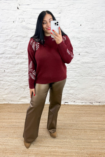 Elevate your wardrobe with The Maggie Jumper in Port, featuring exquisite embroidered leaves that add a touch of nature-inspired elegance. This knit jumper combines striking design with stylish comfort, making it a perfect statement piece for any season. Its rich hue and detailed embroidery create a sophisticated look that effortlessly enhances your outfit.