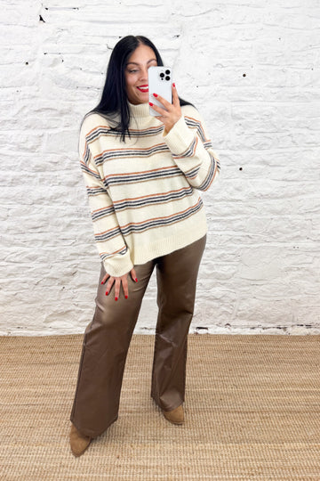 Elevate your wardrobe with the Monna Stripe Jumper in cream, featuring a cosy roll neck and vibrant multicolour stripes. This knit jumper blends classic comfort with a playful edge, perfect for layering or making a statement on its own. Its soft texture and eye-catching design bring effortless style to any outfit.