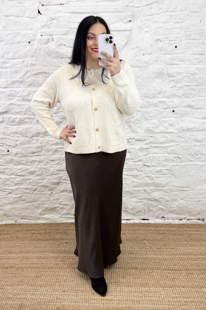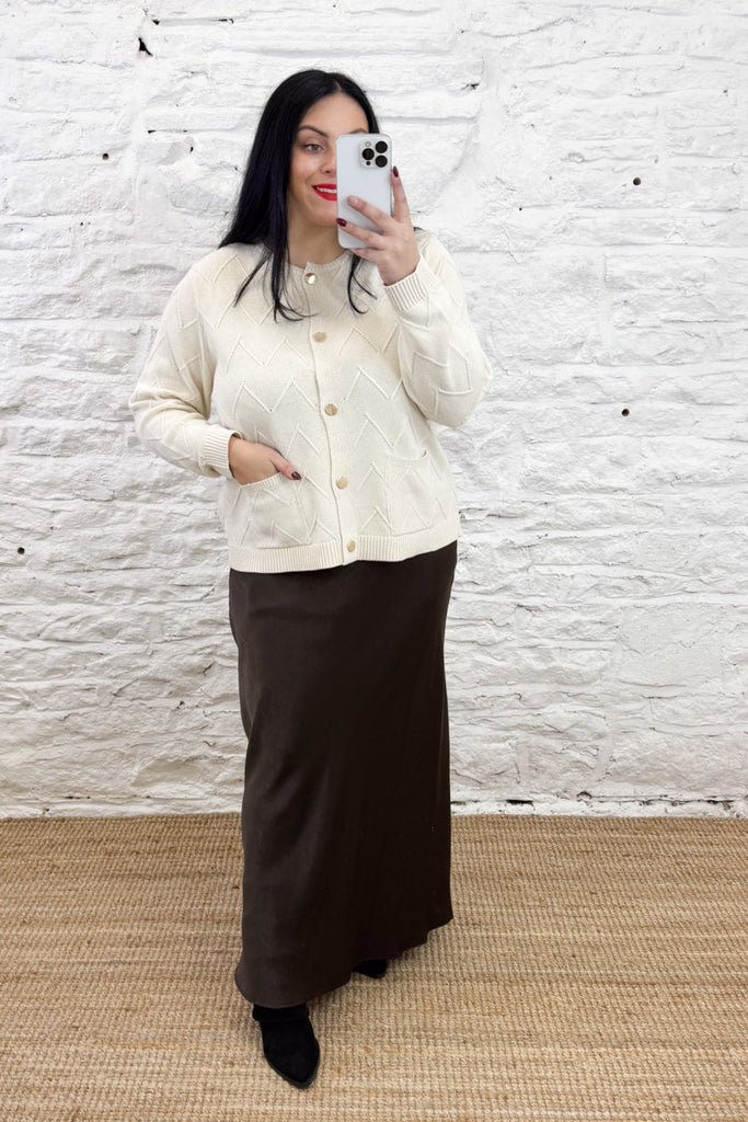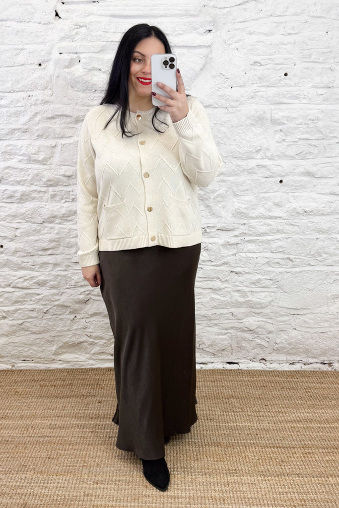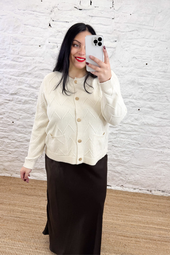 Elevate your wardrobe with The Nanni Cardigan. This textured knit piece features tailored styling that flatters every silhouette, complemented by chic gold buttons and practical pockets. Perfect for adding a smart, polished layer to any outfit, it effortlessly blends comfort with refined elegance.