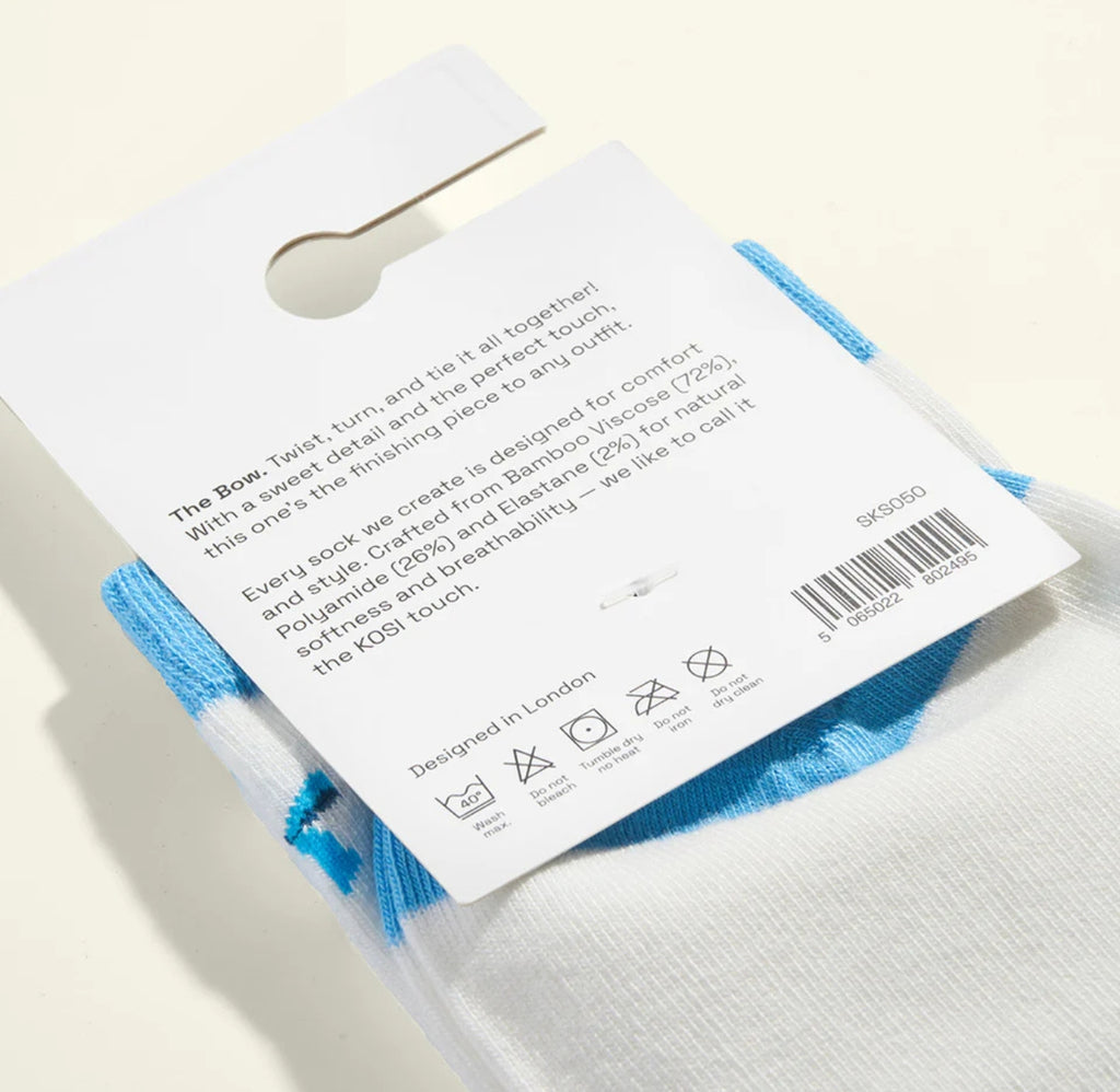 Step up your sock game with The Bow Socks by KOSI, combining elegance and durability. Crafted from a superior mix of Bamboo Viscose, these socks provide a smooth, breathable feel that keeps your feet comfortable throughout the day. Designed to preserve their shape and softness, they stay looking and feeling fresh wash after wash. Ideal for anyone who appreciates enduring style and exceptional quality in every stride.