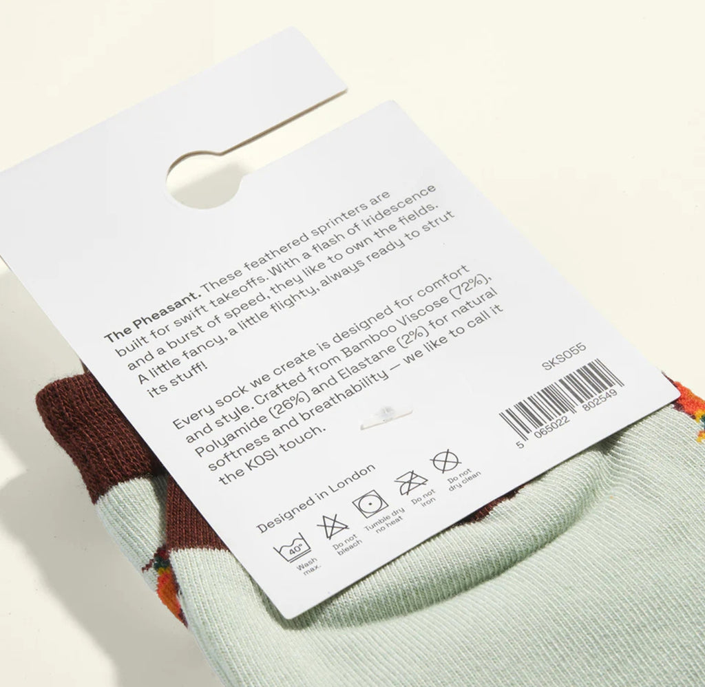 Step up your sock game with The Pheasant Socks by KOSI, combining elegance and durability. Crafted from a superior mix of Bamboo Viscose, these socks provide a smooth, breathable feel that keeps your feet comfortable throughout the day. Designed to preserve their shape and softness, they stay looking and feeling fresh wash after wash. Ideal for anyone who appreciates enduring style and exceptional quality in every stride.