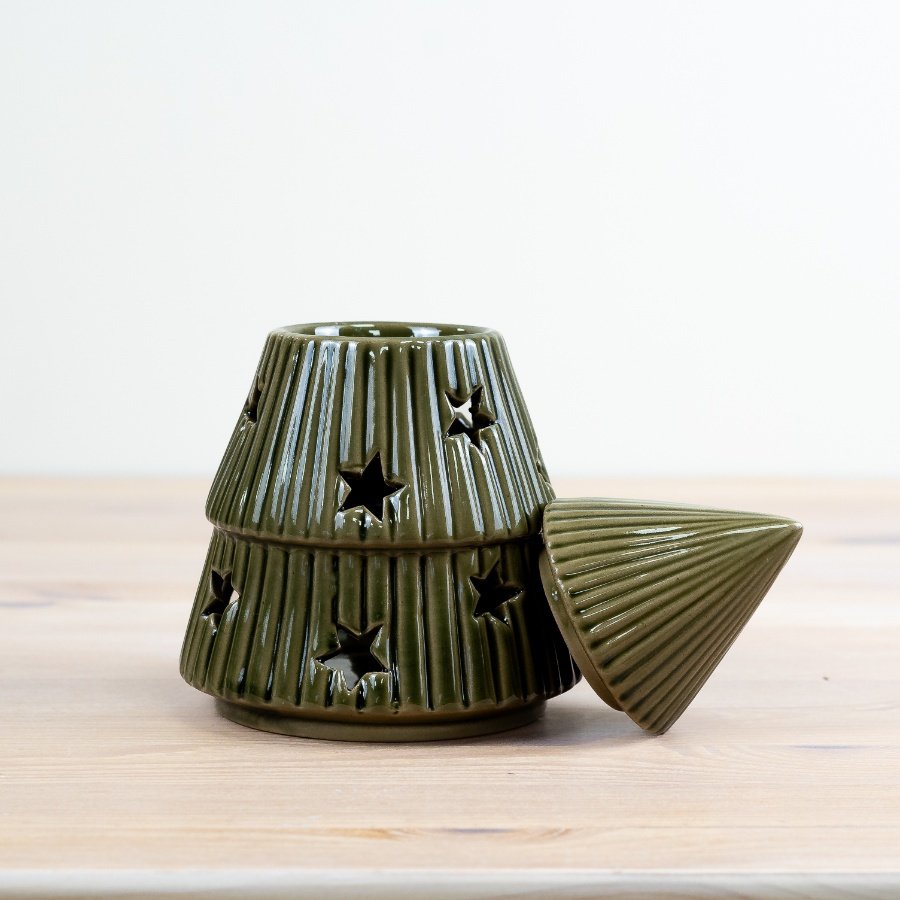 This green-glazed tree oil burner, adorned with charming star cutouts, adds a festive touch to your home décor. Perfect for use with fragrance oils and melts, it creates a warm, inviting atmosphere that enhances any room during the holiday season. Its elegant design makes it both a decorative piece and a functional accessory for cosy, scented moments.