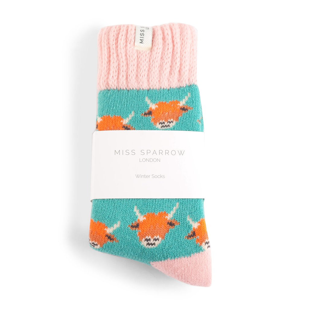 Miss Sparrow Duck Egg Winter Highland Cows Socks