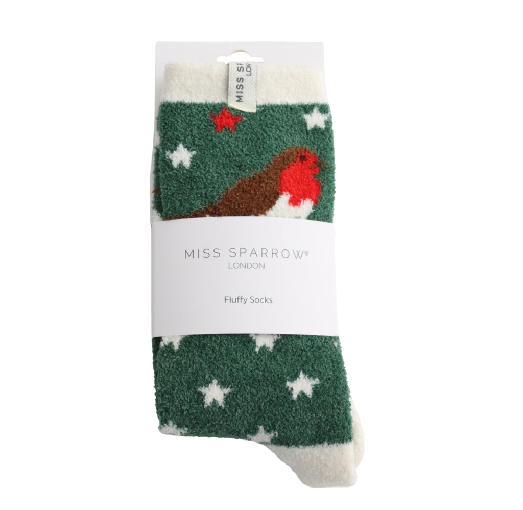 Miss Sparrow Green Fluffy Festive Robins Socks