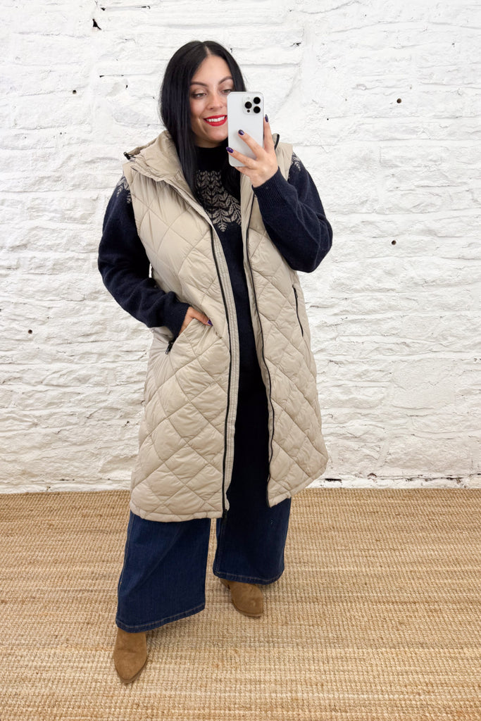 The Berta Gilet in Nude is a stylish longline padded gilet designed for effortless layering. Featuring a zip front and a cosy hood, it offers both warmth and versatility. Practical pockets add functionality, making it perfect for on-the-go days when you want to stay comfortable without compromising on style.