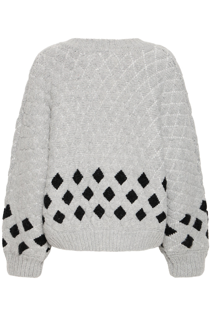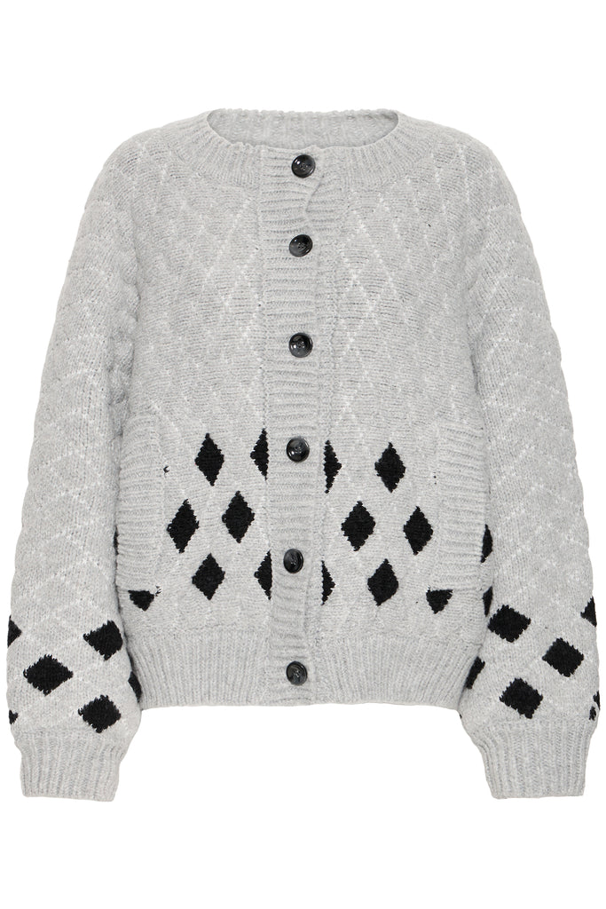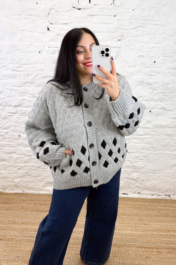 Elevate your layering game with The Cortana Cardigan in grey, featuring a thick, cosy knit and distinctive checked patchwork details. This stylish piece combines comfort and contemporary design, perfect for adding texture and warmth to any outfit. Ideal for chilly days, it effortlessly blends classic charm with modern flair.