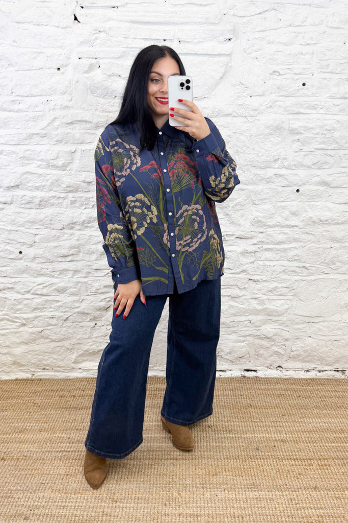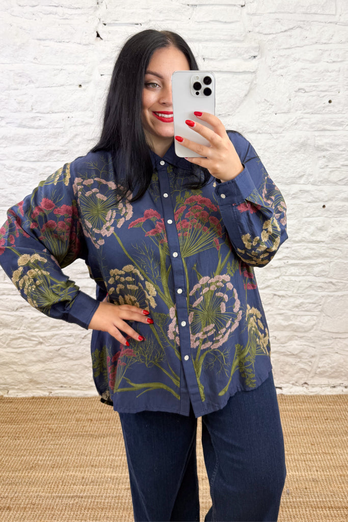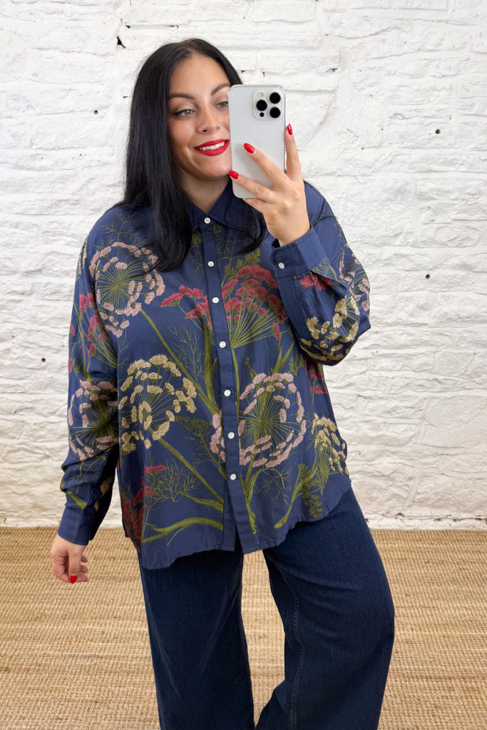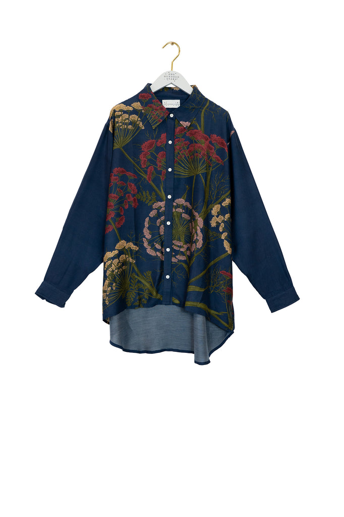 Drawing inspiration from a towering cow parsley on the verge of seeding, this shirt blends pink, rust, and camel floral tones against a deep midnight blue backdrop. Designed for both work and weekend wear, it features dropped shoulders, a dipped hemline, and delicate mother of pearl buttons. The longline silhouette offers a graceful flow and an effortlessly chic style, ideal for any season.
