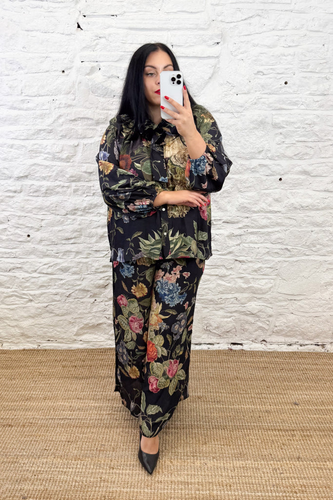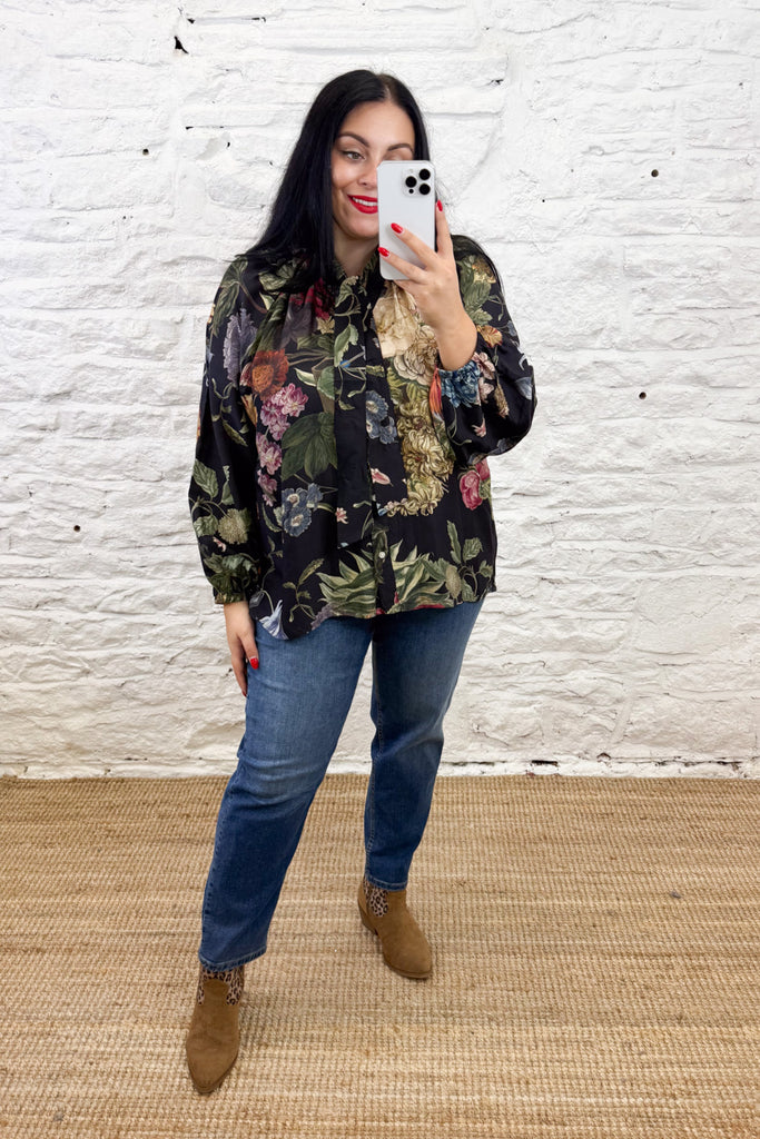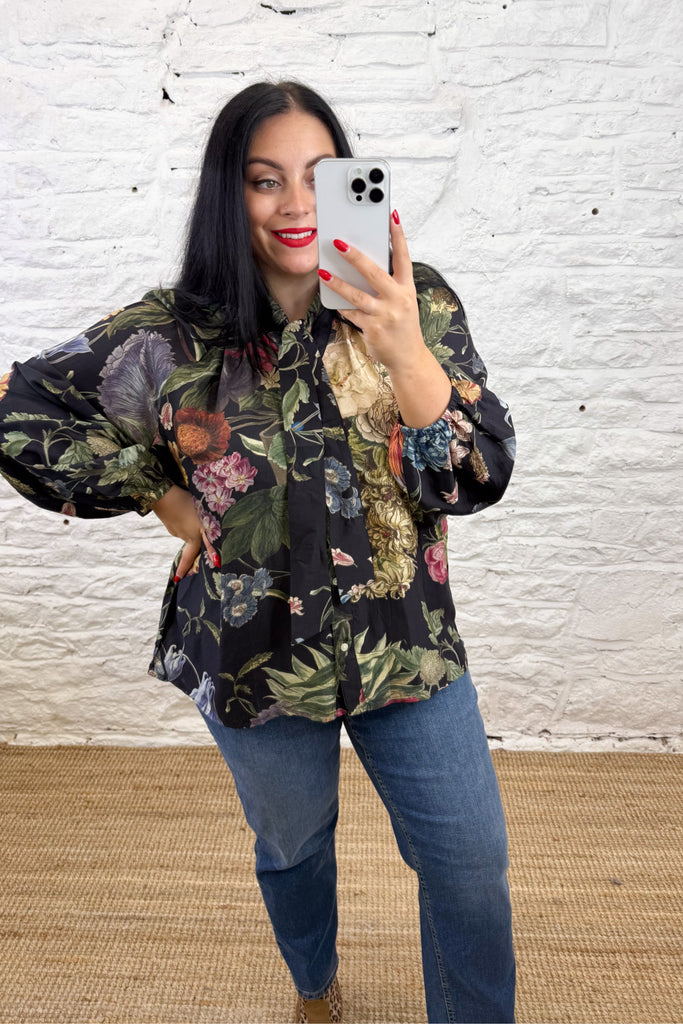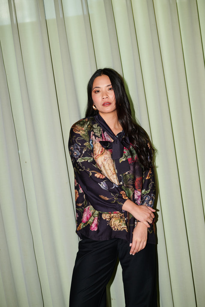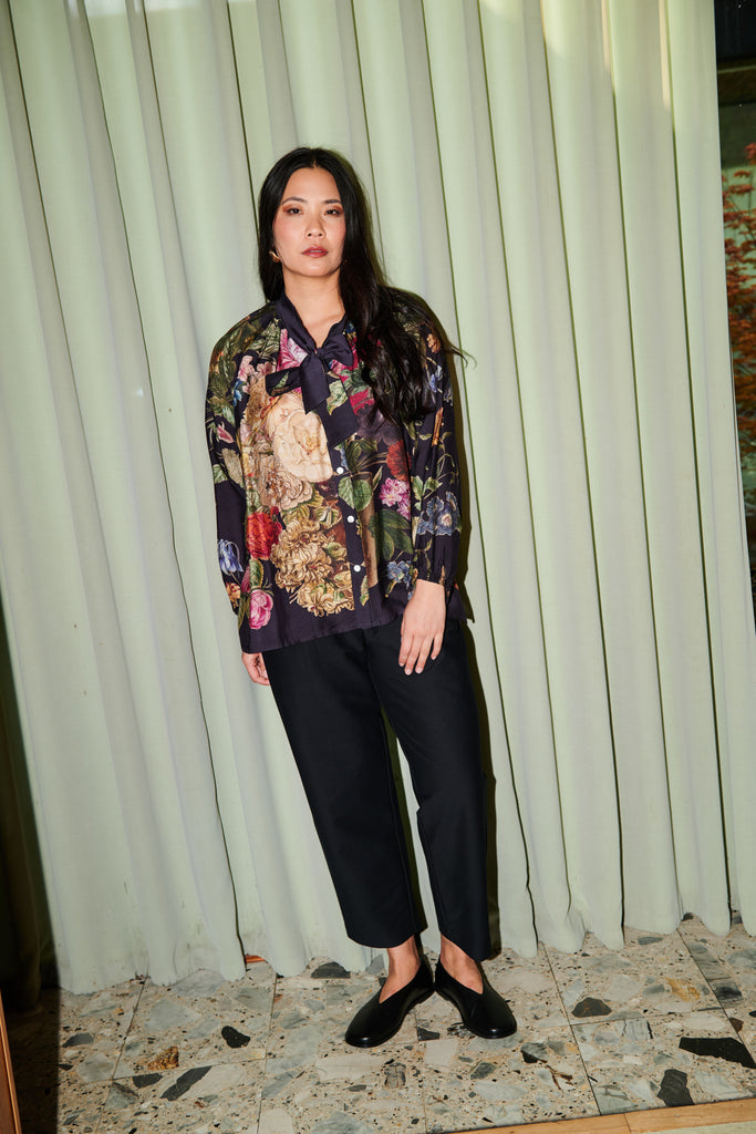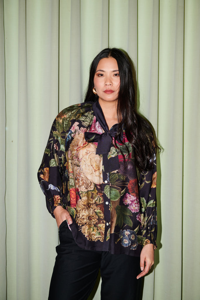 Drawing inspiration from the Dutch Old Masters, this blouse features a vibrant bouquet of primroses, auriculas, and polyanthus in rich, bold hues. The intricate print details are simply exquisite. A classic silhouette that beautifully showcases One Hundred Star's signature design. Crafted from soft modal fabric with bracelet-length sleeves, a gathered neckline, and mother-of-pearl buttons, this Pussy Bow blouse offers both elegance and comfort.