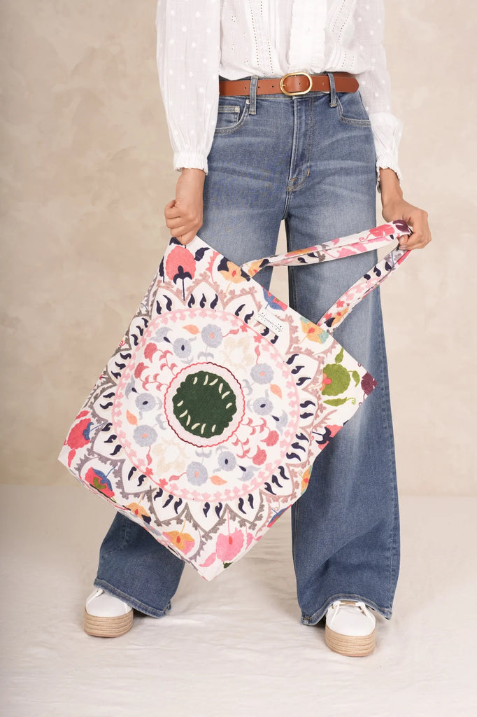 Expertly crafted with a vibrant, oversized pattern inspired by traditional East Asian Susani needlework, this Susani Pink Canvas Bag is 100% sustainable cotton and perfect for multiple uses. From reusable shopping to a stylish book or beach bag, its versatility matches its beauty. Don't miss out on this head-turning bag!
