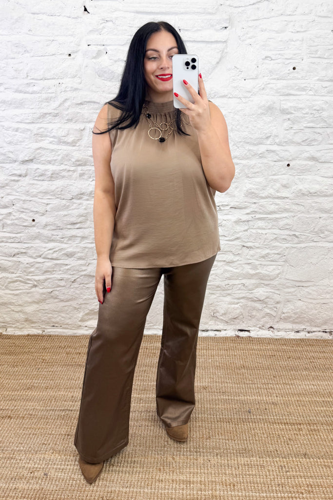 Elevate your party wardrobe with The Aileen Top in taupe. This sleeveless high-neck design features a silky sheen that catches the light beautifully, creating an elegant silhouette. Its flattering fit enhances your natural shape, making it the perfect choice for sophisticated evenings and festive celebrations.
