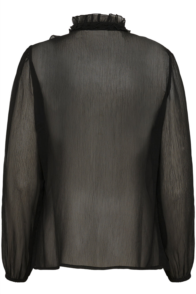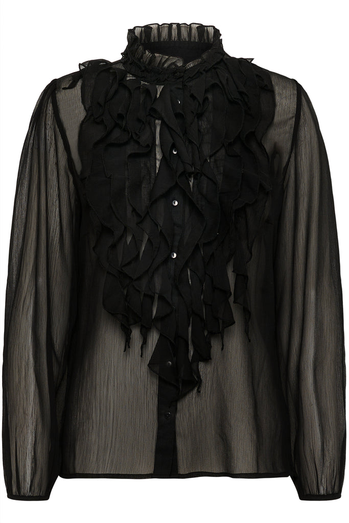 Elevate your wardrobe with The Lilja Shirt in black, featuring a delicate sheer fabric that adds a touch of elegance. The button-up front and ruffled detailing create a refined silhouette, perfect for pairing with edgy pleather trousers. This blouse effortlessly blends softness with modern style, making it a versatile piece for both day and night looks.