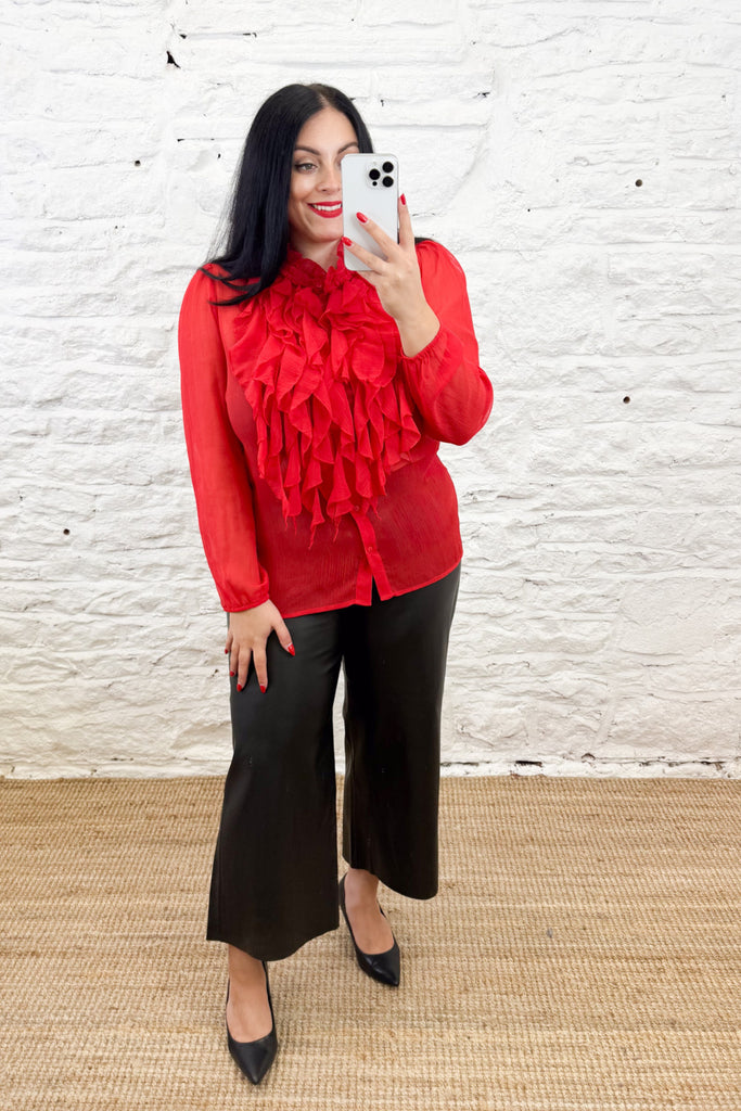 Elevate your wardrobe with The Lilja Shirt in red, featuring a delicate sheer fabric that adds a touch of elegance. The button-up front and ruffled detailing create a refined silhouette, perfect for pairing with edgy pleather trousers. This blouse effortlessly blends softness with modern style, making it a versatile piece for both day and night looks.