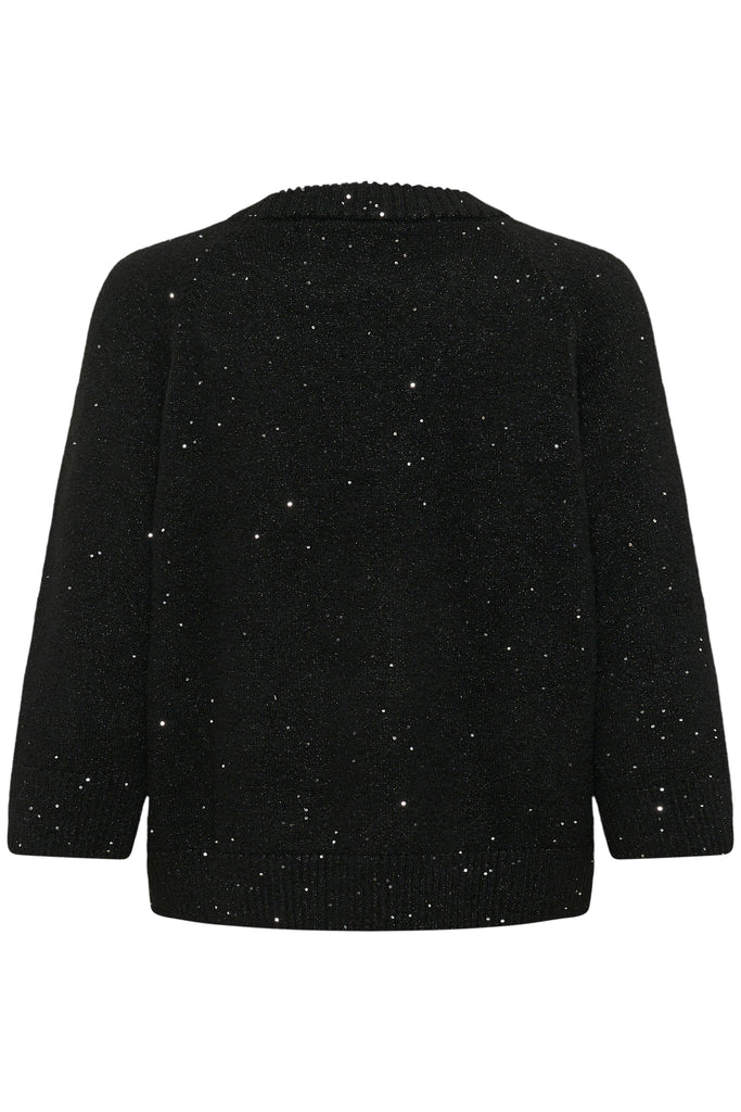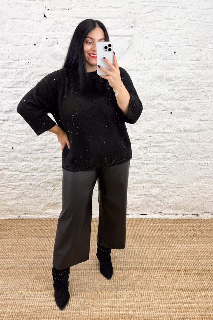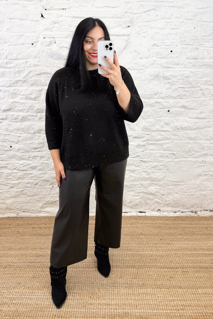 Elevate your wardrobe with The Nova Jumper in black, featuring a subtle sparkle yarn that adds a refined shimmer to your look. Its cropped sleeves offer a modern silhouette, perfect for layering or wearing solo. This knit jumper blends understated glamour with contemporary style, making it a versatile piece for your a/w wardrobe.
