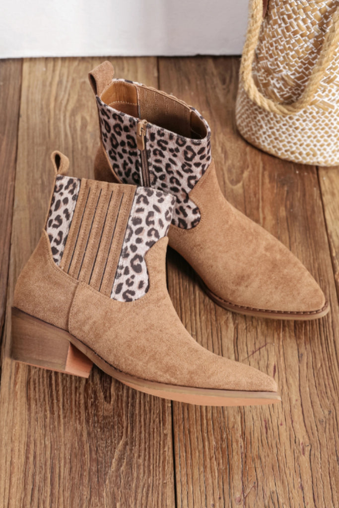 Step into autumn with a wild western twist. Our Leopard Print Cowboy Boots blend classic cowgirl charm with a fierce, fashion-forward edge. Crafted from soft tan suede with a bold leopard print panel, these ankle cowboy boots are you new go-to for effortless everyday style.