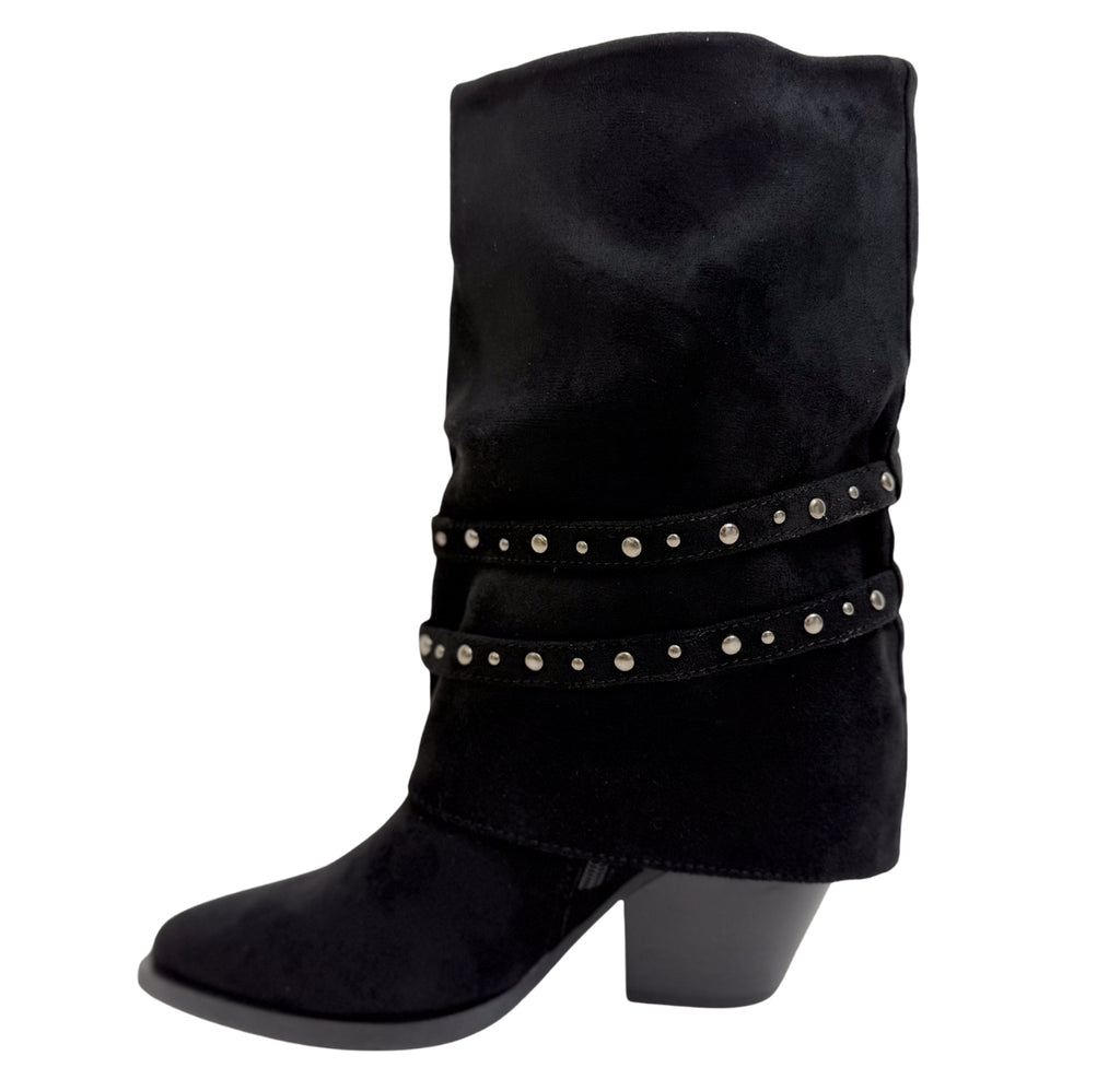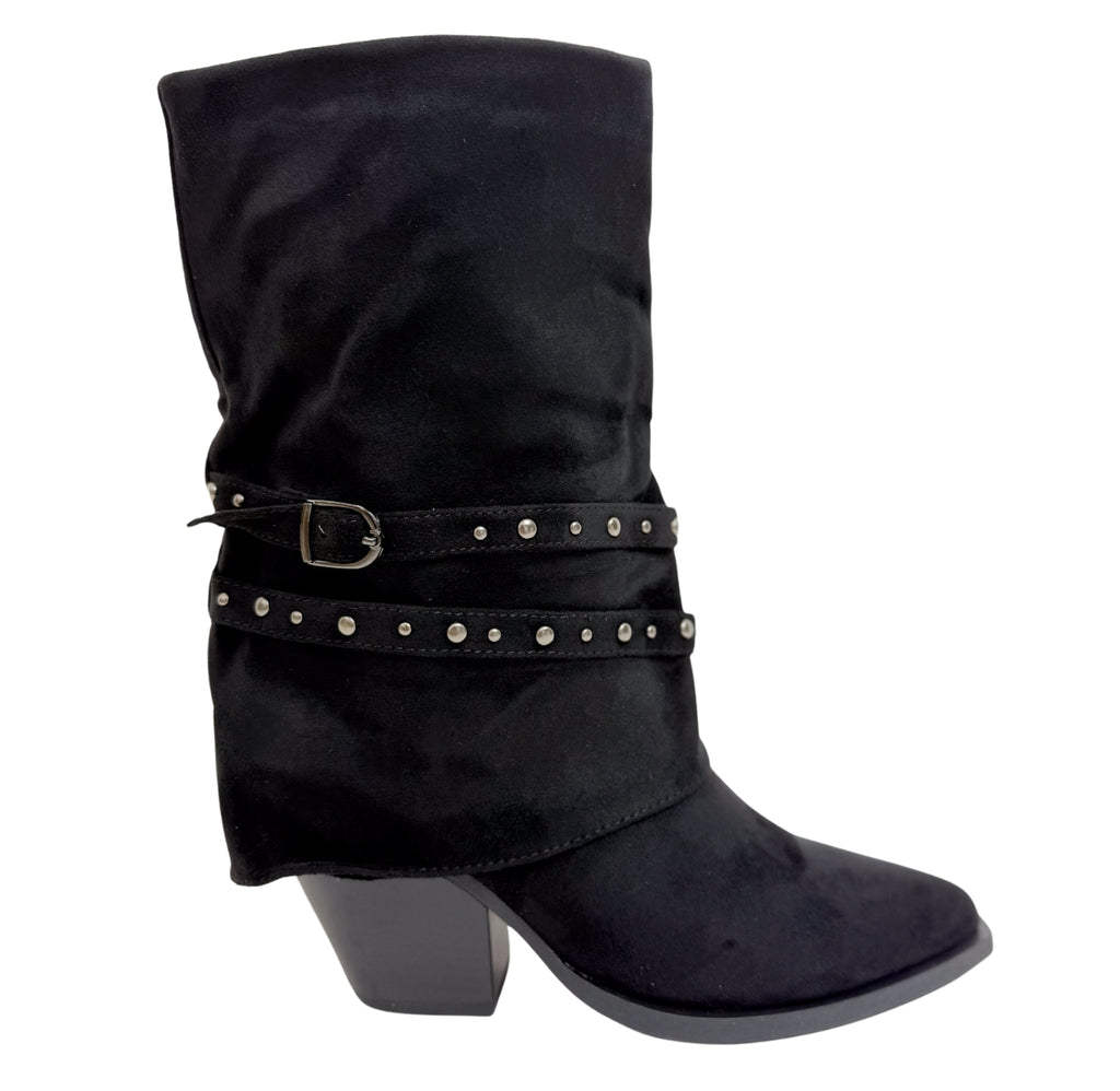 The Lady Lonestar features a chic pointed toe and mid-calf silhouette crafted in soft black faux suede. Highlighted by a studded buckle strap, this Western-inspired cowboy boot combines rugged details with refined style, making it a must-have statement piece for elevating your autumn wardrobe.