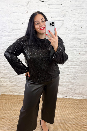 Discover the perfect party essential with The Solia Sequin Top. Designed to flatter with its flattering cut and sparkling sequins, this black top is not only easy to style but also adds a touch of festive glam to any look. Upgrade your wardrobe with this stylish and versatile piece.