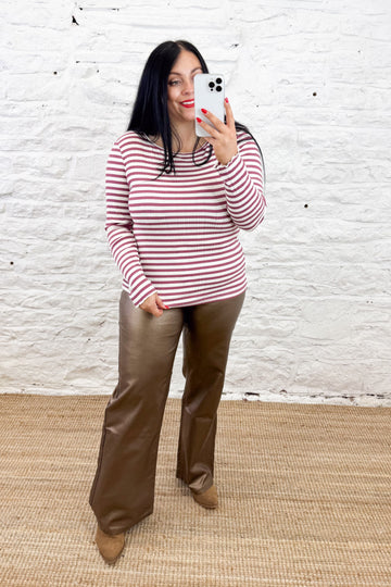 Elevate your wardrobe with The Cella Striped Top, featuring maroon and white stripes and a flattering ribbed finish. Its long sleeves offer versatile layering options, making it a chic staple for any season. Perfect for pairing with tailored trousers or denim, this top effortlessly blends classic style with modern texture.