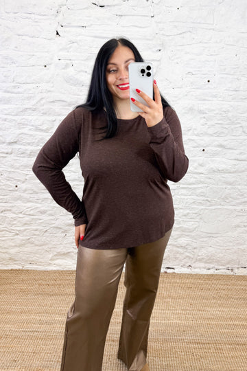 Elevate your autumn-winter wardrobe with The Rebel Top in Coffee Bean. This long-sleeved, round-neck base layer features subtle silver metallic yarn flexes, adding a touch of shimmer to your look. Perfect for layering or wearing solo, it combines comfort and style effortlessly, making it an essential piece for cooler seasons.