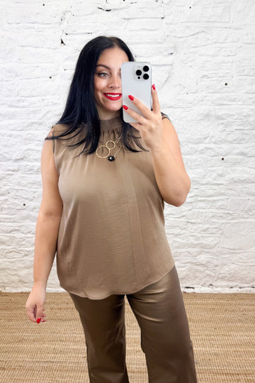 Elevate your party wardrobe with The Aileen Top in taupe. This sleeveless high-neck design features a silky sheen that catches the light beautifully, creating an elegant silhouette. Its flattering fit enhances your natural shape, making it the perfect choice for sophisticated evenings and festive celebrations.