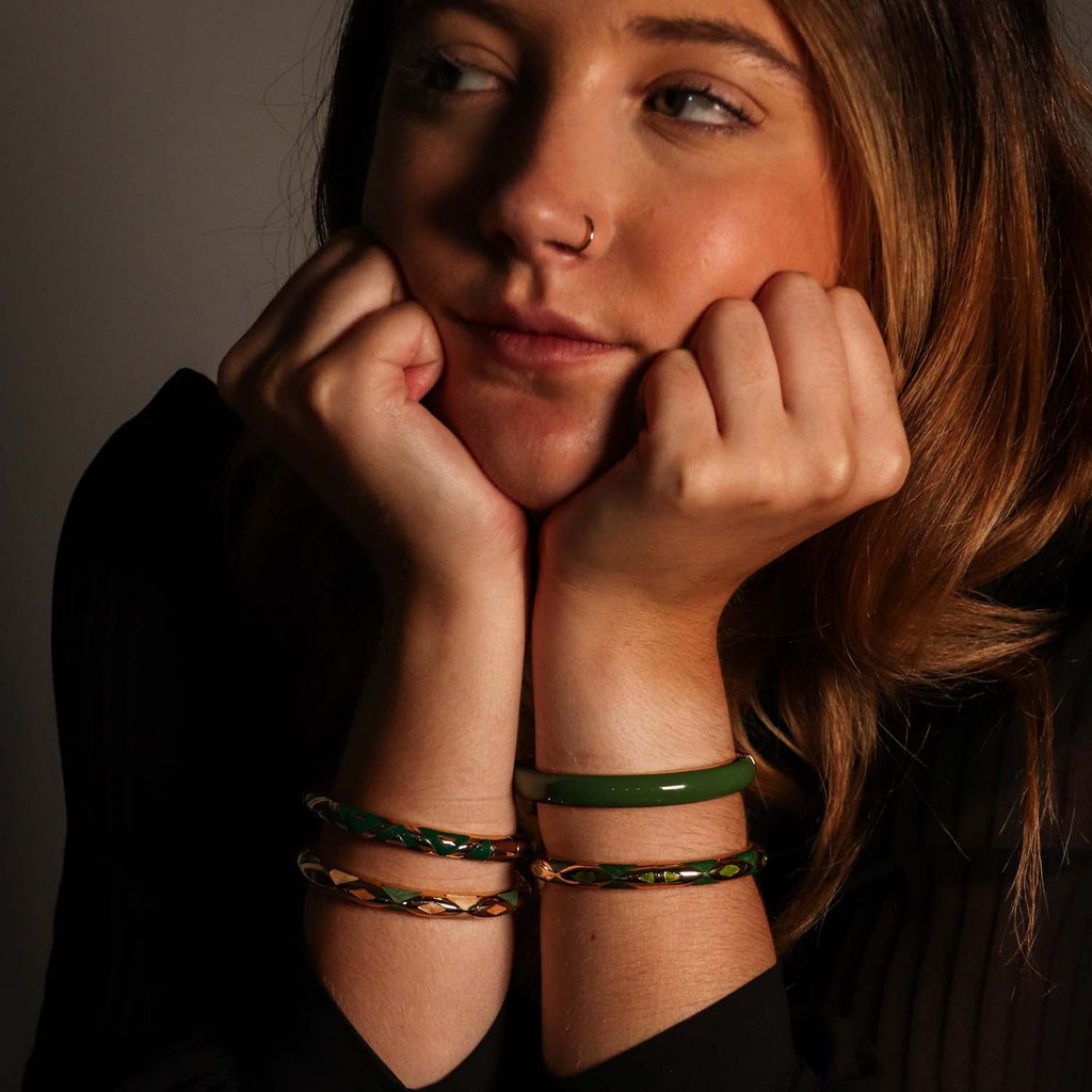 Elevate your accessory game with The Green Pattern Enamel Bangle, a sleek and luxurious piece perfect for stacking or layering. Its patterned enamel finish adds a subtle yet refined touch, allowing seamless pairing with your favourite bracelets for a curated, stylish look. Ideal for everyday elegance or special occasions.
