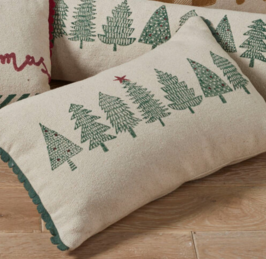 Add a festive touch to your home with this rectangular cushion featuring charming Christmas tree designs. Hand block printed on natural-coloured 100% cotton dhurrie fabric, it is bordered with a green trim for a classic holiday look. The feather-filled cushion offers plush comfort, while the zip closure allows for easy removal and cleaning. Perfect for cosying up your living space this season.
