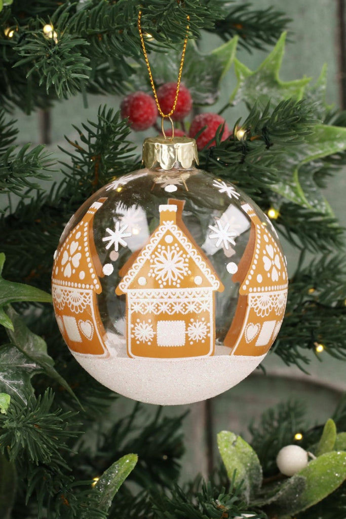 Brighten up your Christmas decor with our Clear Gingerbread House Glass Bauble. Featuring a whimsical snow ball design, this beautiful bauble infuses your tree with a festive charm. Perfect for a gingerbread themed tree.