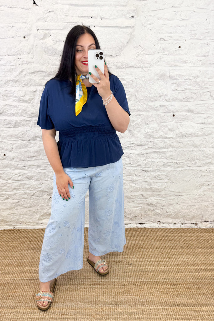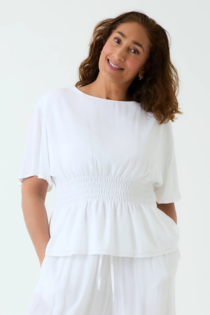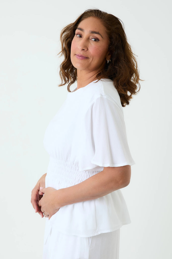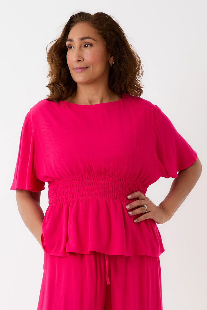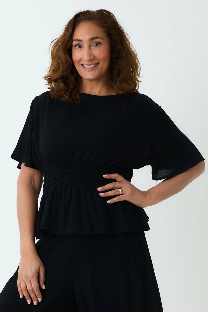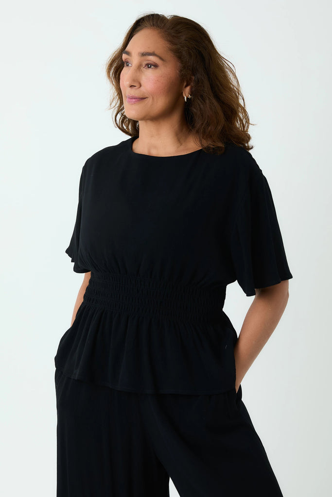 Expertly crafted from luxurious viscose crepe, the Tay Crepe Shirring Top features a flattering peplum style that can easily be dressed up or down. Experience the perfect balance of elegance and versatility with this must-have addition to your wardrobe.