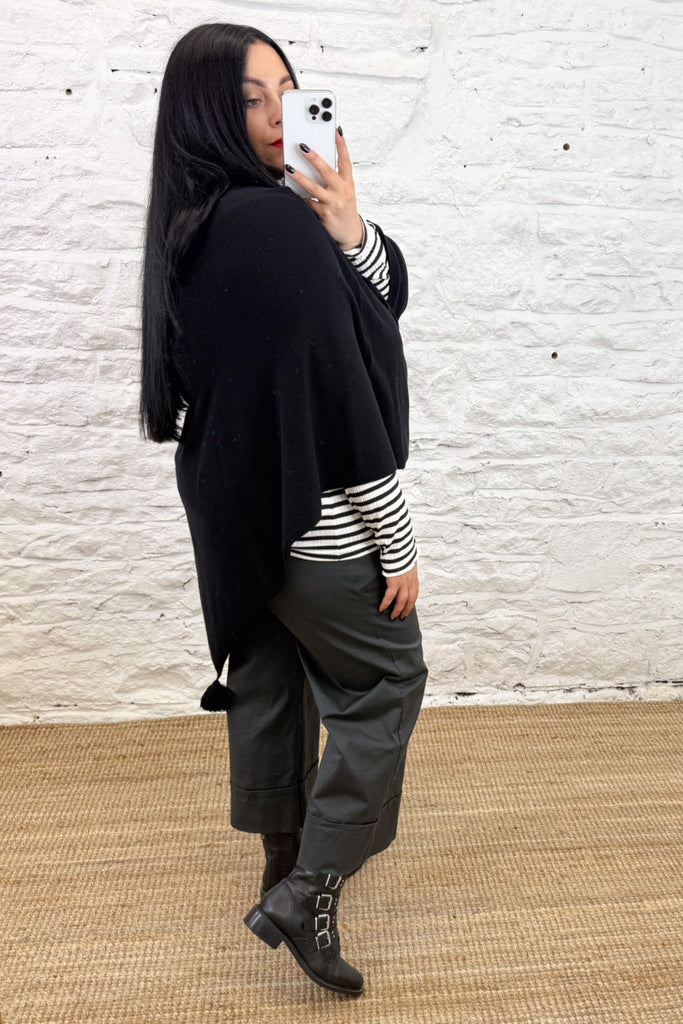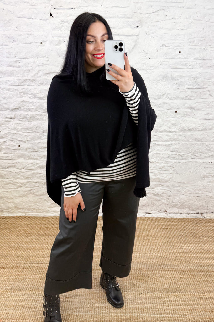Introducing the Anna Poncho, a sleek and stylish addition to your wardrobe. This black, asymmetrical poncho features a tassel drop for added flair. With its unique design, this poncho is perfect for adding a touch of sophistication to any outfit. Upgrade your style with the Anna Poncho.