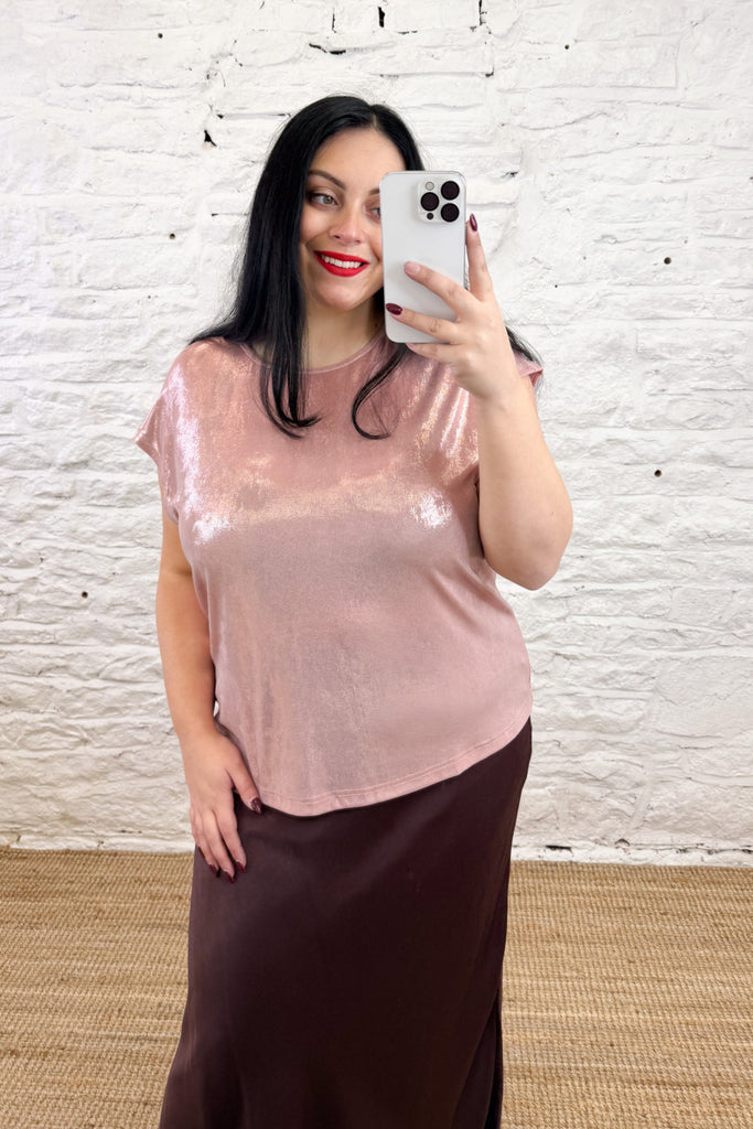 Elevate your festive wardrobe with The Franny Tee in Rose Metallic. This shimmering metallic t-shirt is designed to make a bold statement at Christmas and New Year parties, combining eye-catching shine with effortless style. Perfect for layering or wearing solo, it adds a glamorous edge to your seasonal looks.