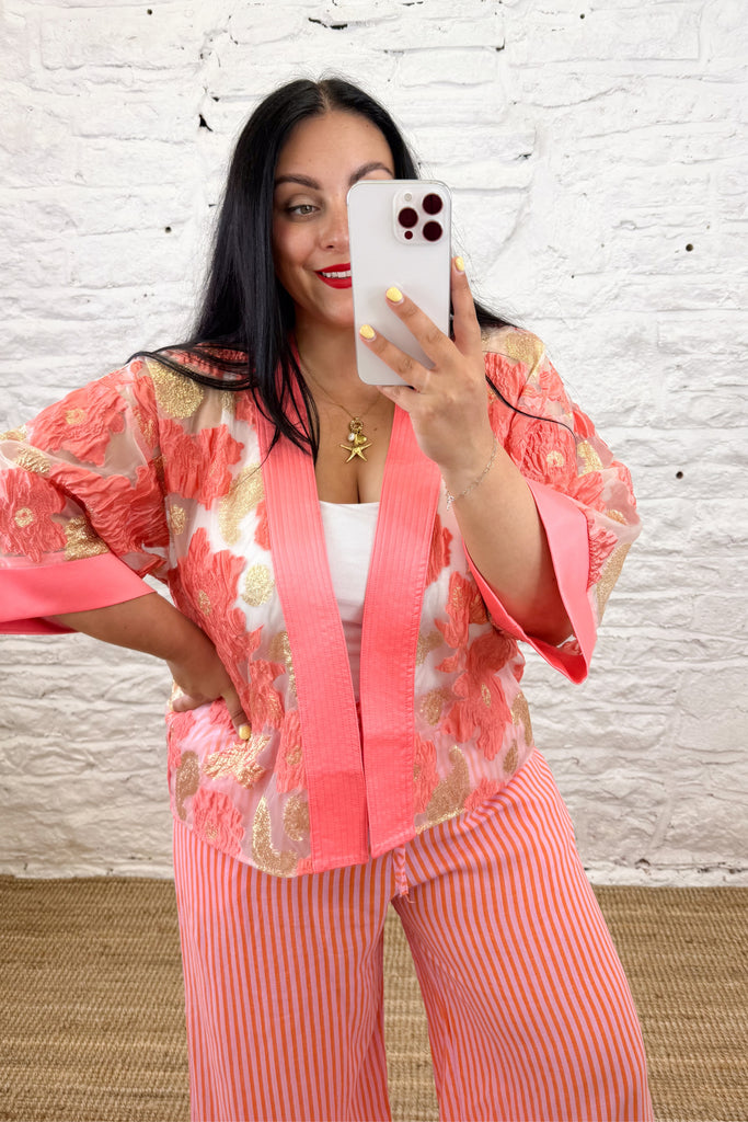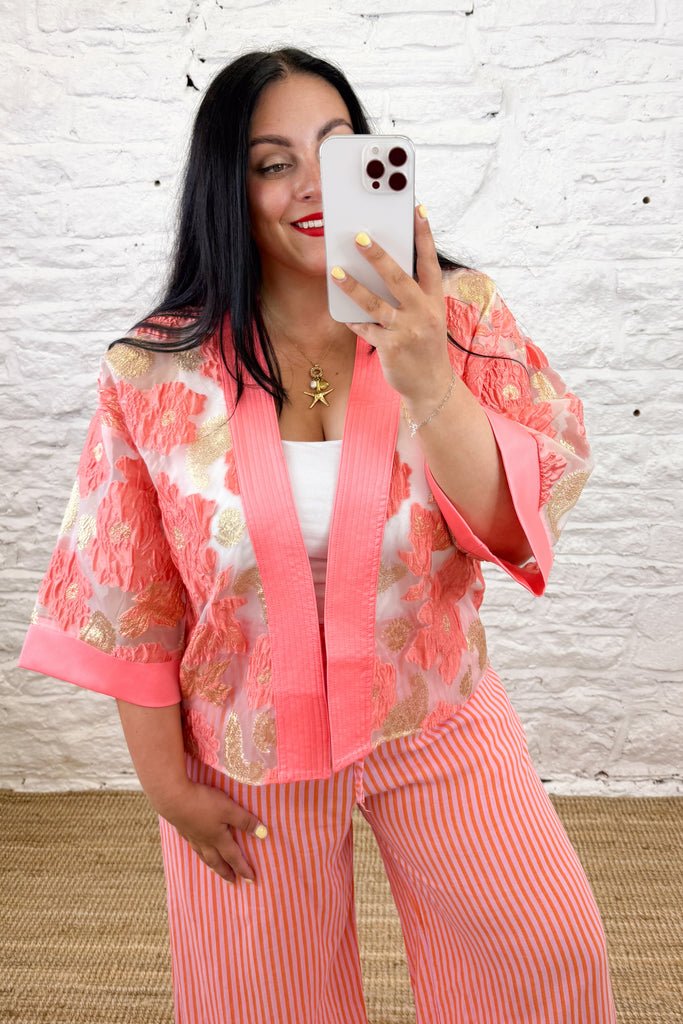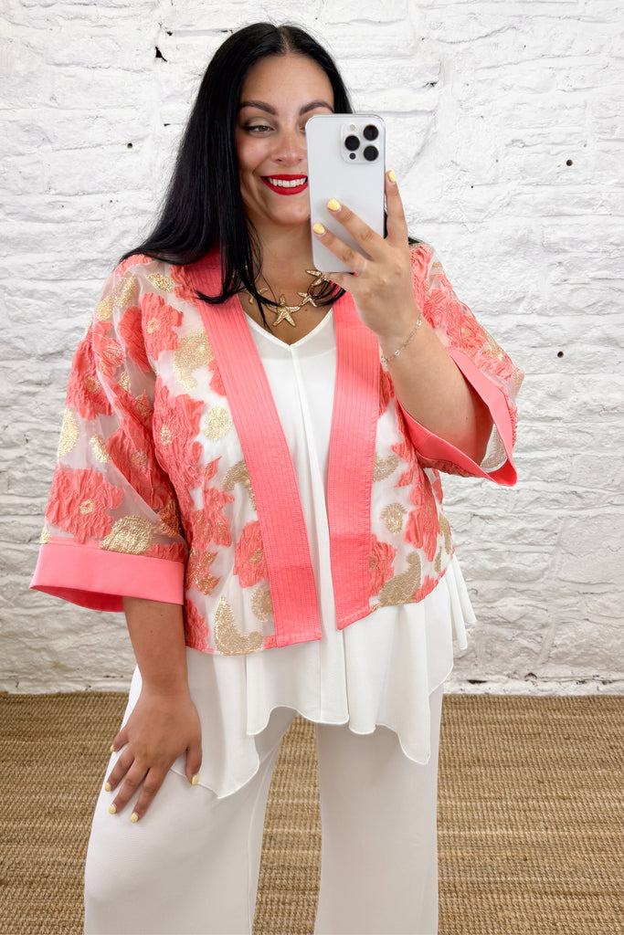 This beautiful kimono jacket features a shorter length and a multi-floral design, making it the perfect addition to your holiday outfit. Its kimono style provides a versatile and elegant look, while the floral pattern adds a touch of femininity. Elevate your wardrobe with the Esmerelda Floral Kimono Jacket.