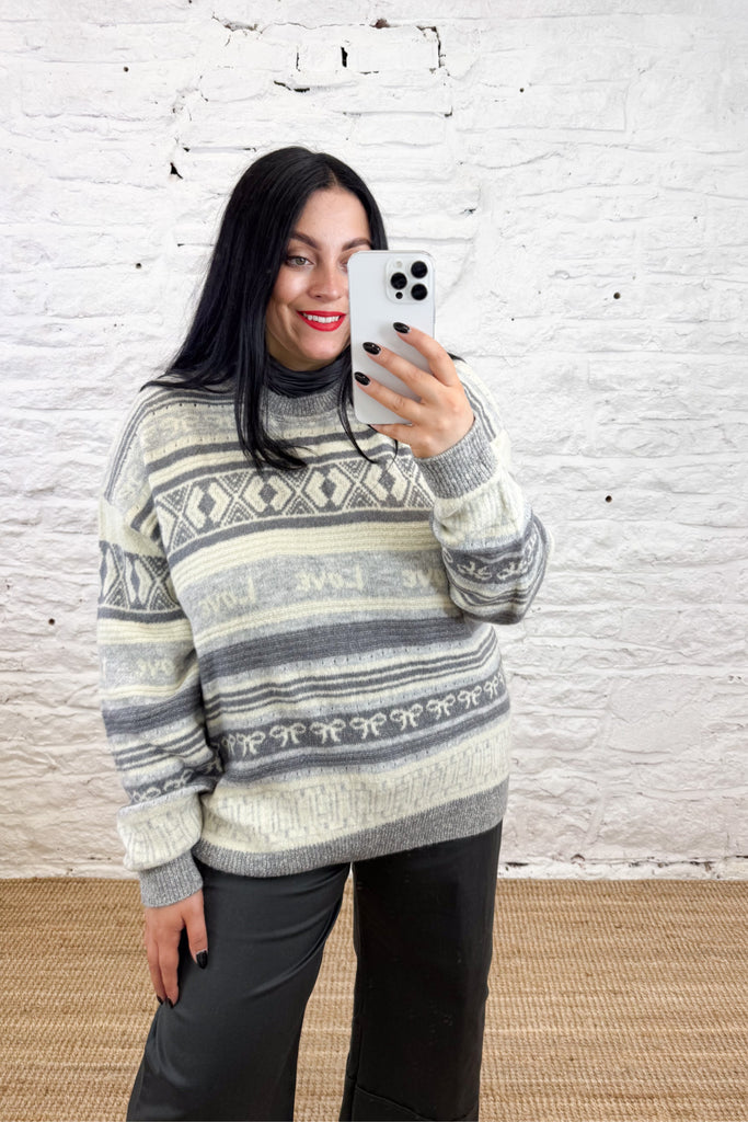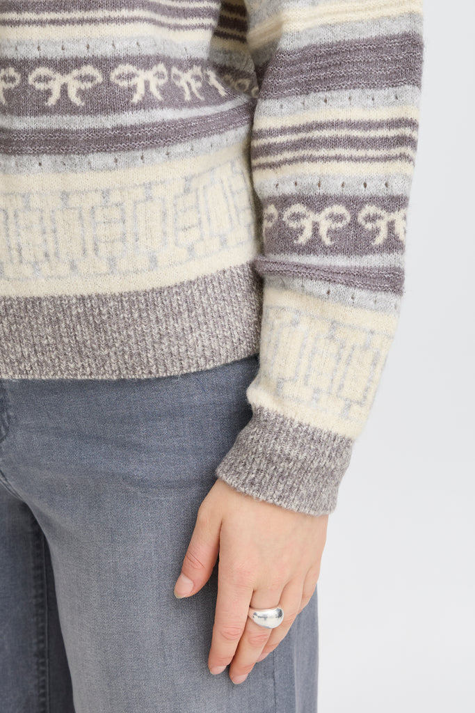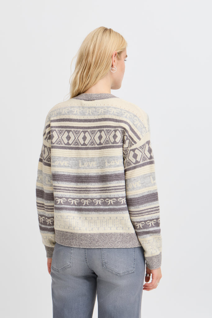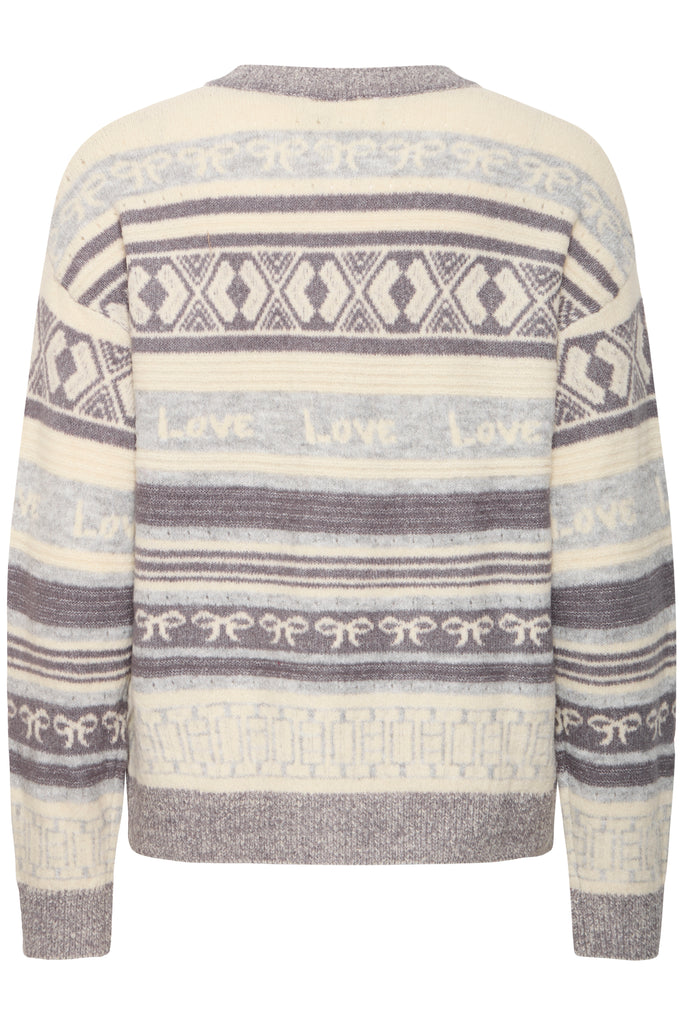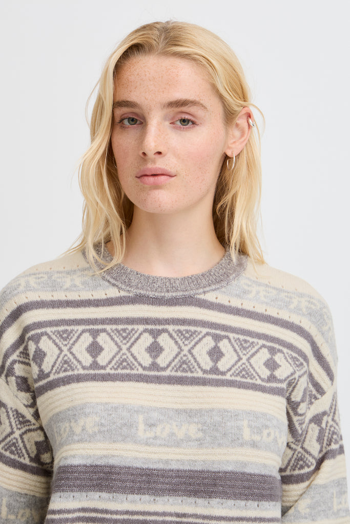 This Hikazo Knit Jumper in Grey Melange offers both comfort and style with its cosy knit design and cute print. Perfect for staying warm and on trend.
