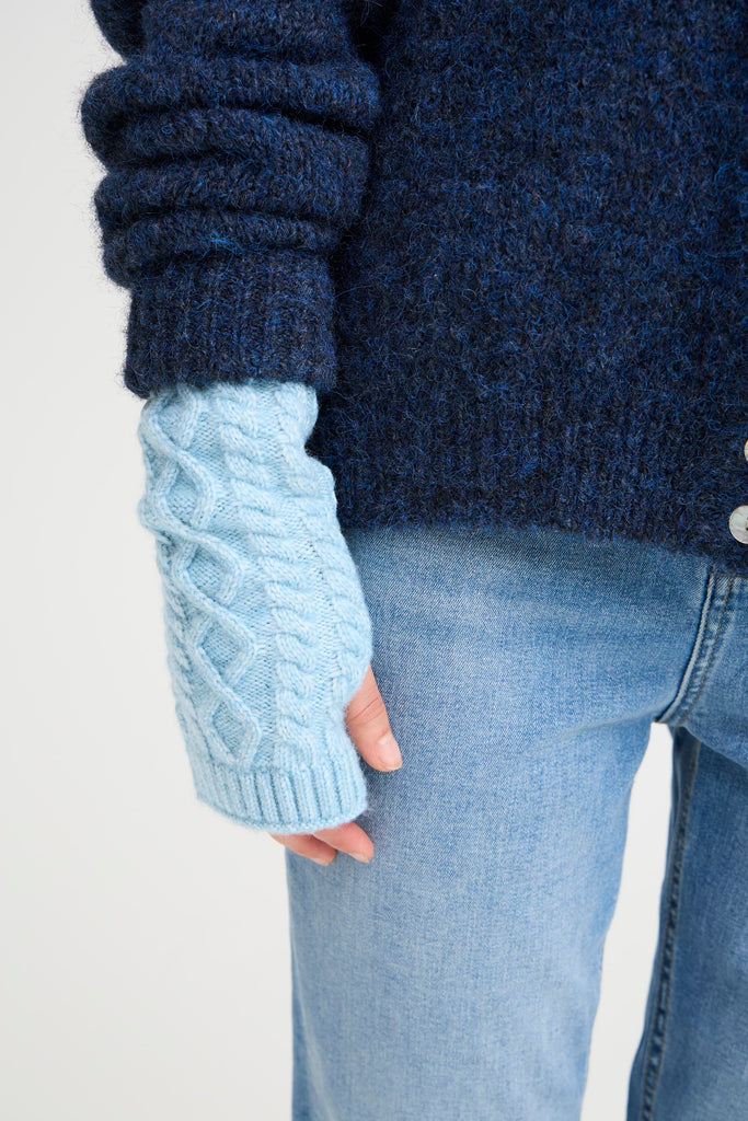 Elevate your winter wardrobe with The Lucy Gloves in Alaskan Blue. These fingerless gloves feature a soft, cosy cable knit design and a practical thumb hole for ease of movement. Perfect for layering, they add a chic touch while keeping your hands warm and free to use your phone or accessories effortlessly. A stylish essential for chilly days.
