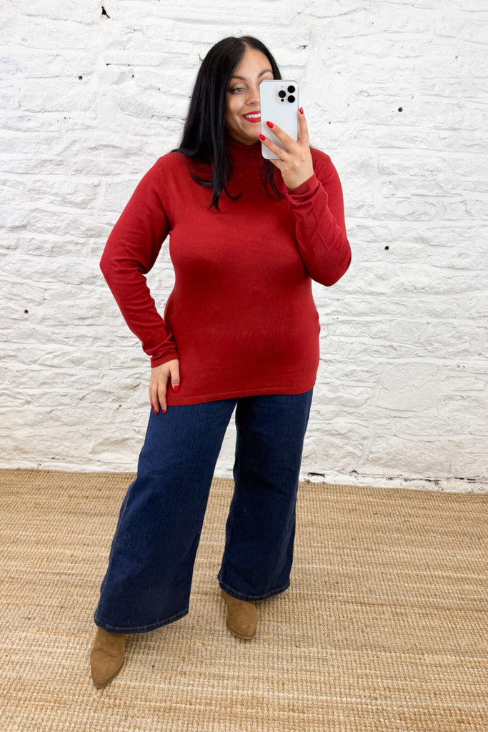 The Mafa Roll Neck in Red is a sleek, lightweight knit top designed for effortless layering. Its soft fabric and classic roll neck silhouette make it a versatile wardrobe staple, perfect for adding warmth and style to any outfit. Elevate your everyday look with this essential piece that blends comfort and chic simplicity.