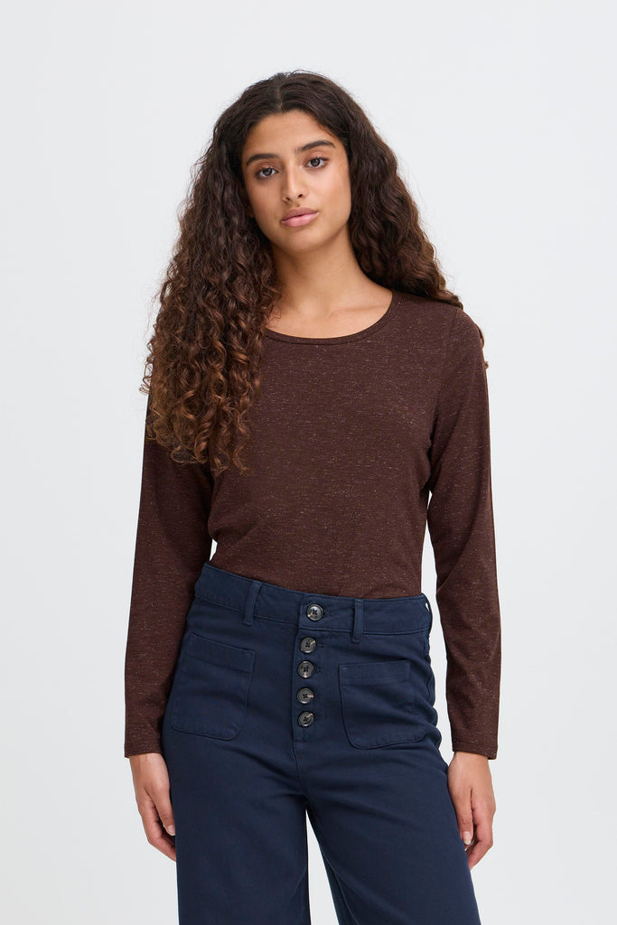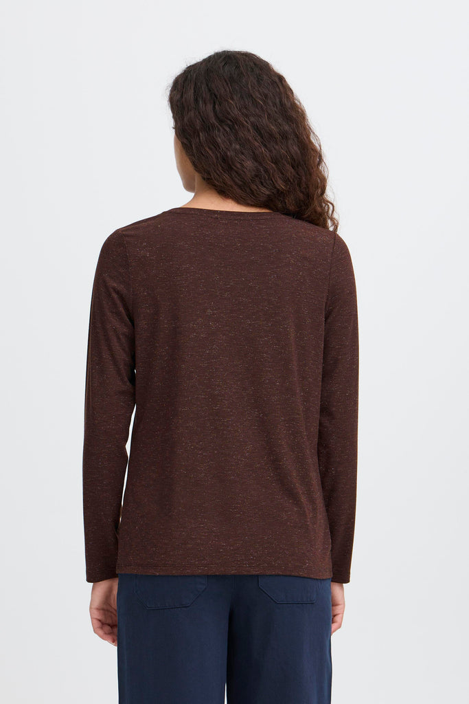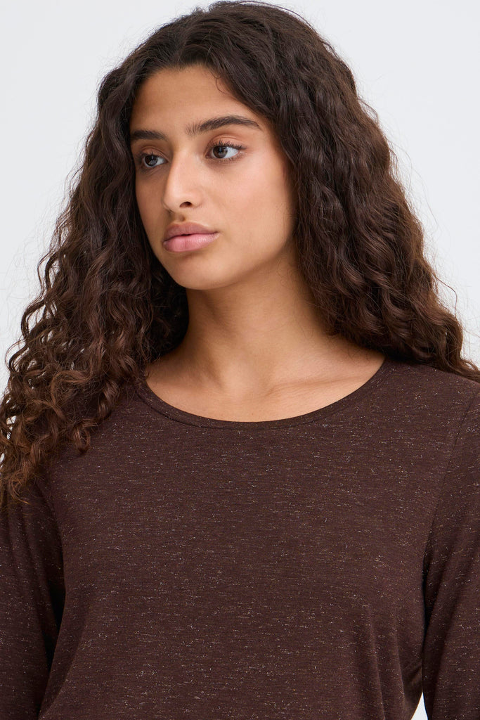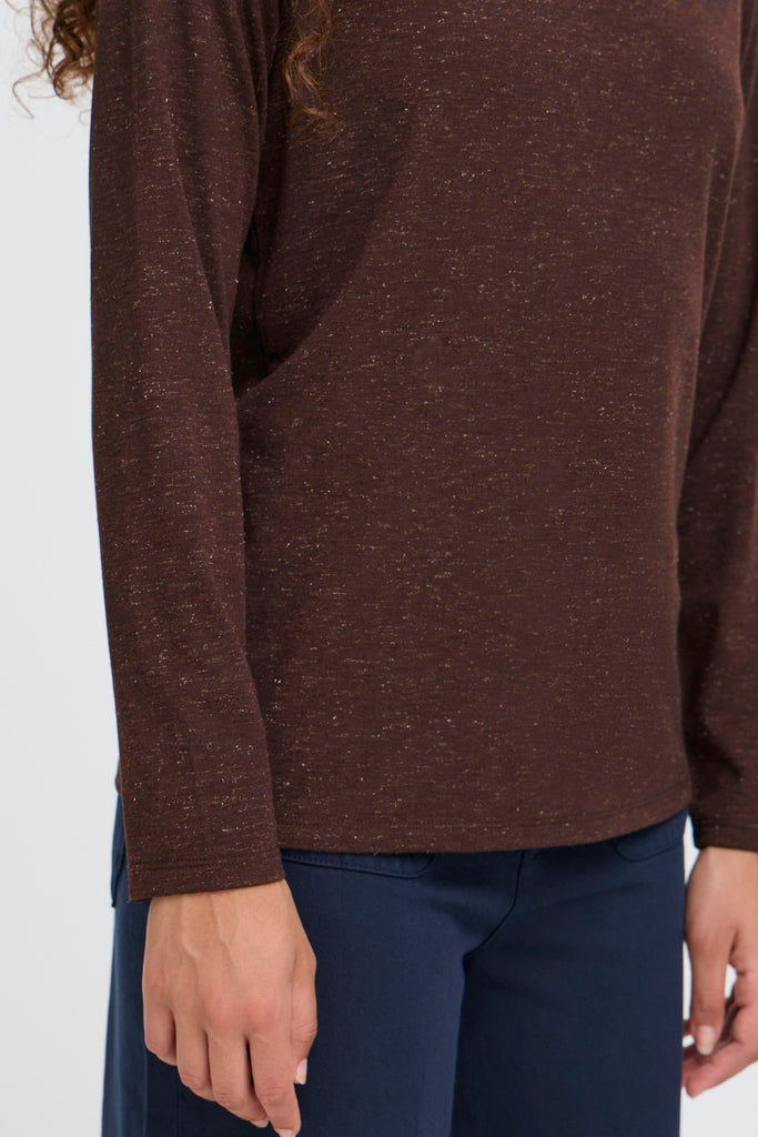 Elevate your autumn-winter wardrobe with The Rebel Top in Coffee Bean. This long-sleeved, round-neck base layer features subtle silver metallic yarn flexes, adding a touch of shimmer to your look. Perfect for layering or wearing solo, it combines comfort and style effortlessly, making it an essential piece for cooler seasons.