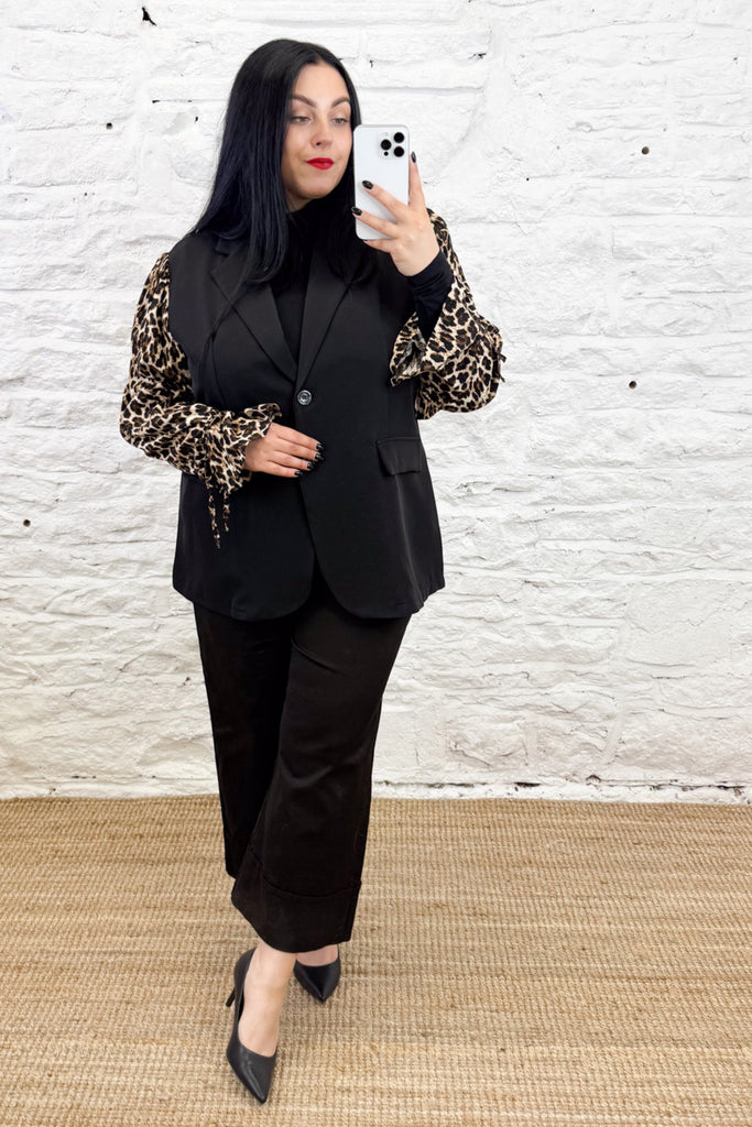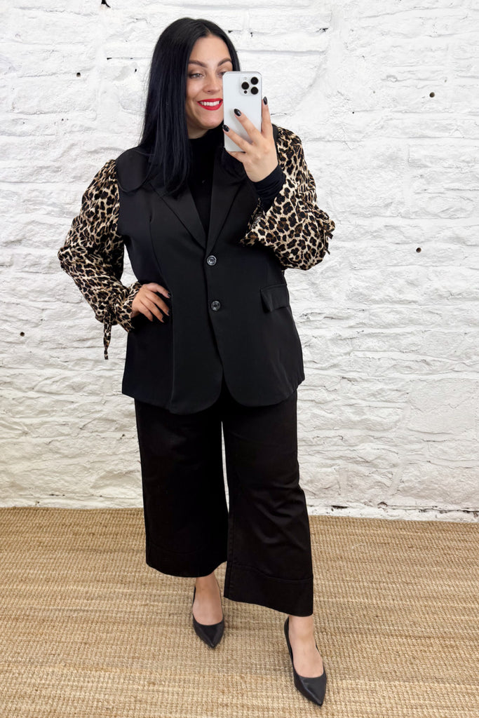 Elevate your wardrobe with The Mimi Animal Print Blazer, a striking blend of classic black tailoring and bold animal print sleeves. The statement sleeves feature adjustable ties at the cuffs, adding a touch of playful sophistication and customisable flair. Perfect for making an unforgettable impression, this blazer effortlessly combines edgy style with refined elegance.