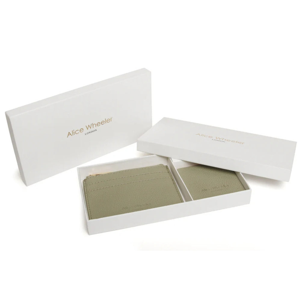 Elevate your style with our Alice Wheeler Pistachio Purse & Mirror Compact Gift Set. Crafted with soft vegan leather, this 2 piece set offers both functionality and elegance. The Verona coin and card purse fits perfectly in a pocket or handbag, while the Vienna compact mirror is a must-have accessory for any handbag. Presented in a luxurious box, it's the perfect gift for any occasion.