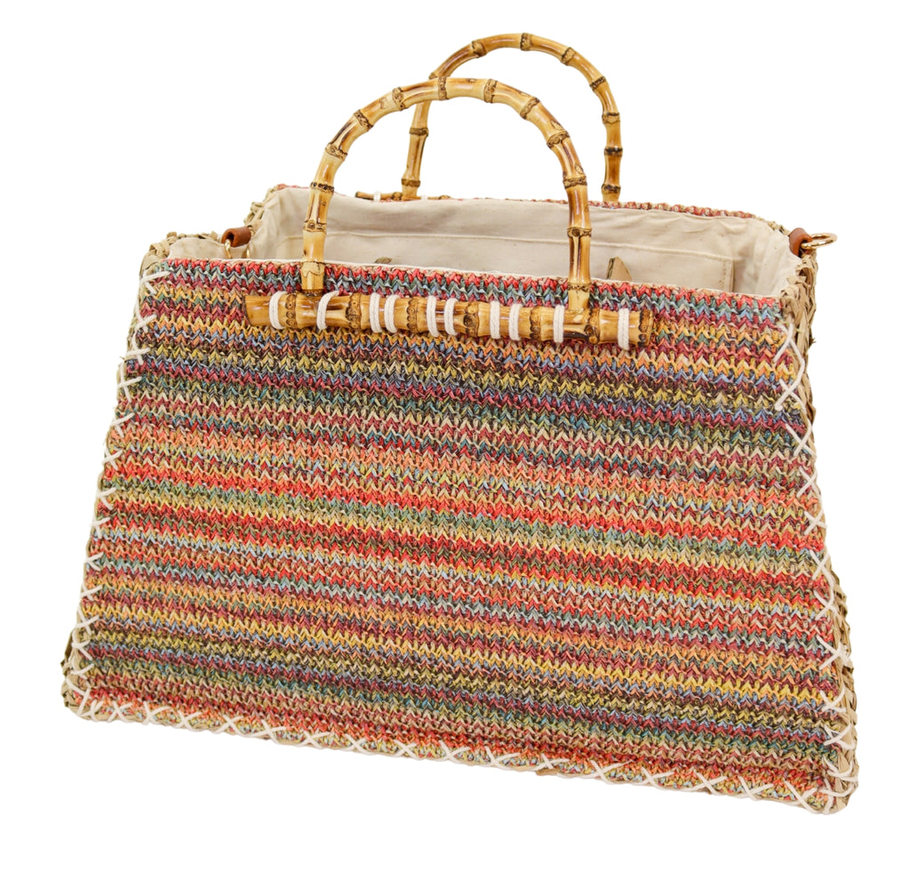 This multi-colored bag features bamboo handles, a zip closure, and a detachable strap for versatile wear. With its structured design and unique raffia material, it's both functional and stylish. Make a statement with the Rayah Multicoloured Bag.
