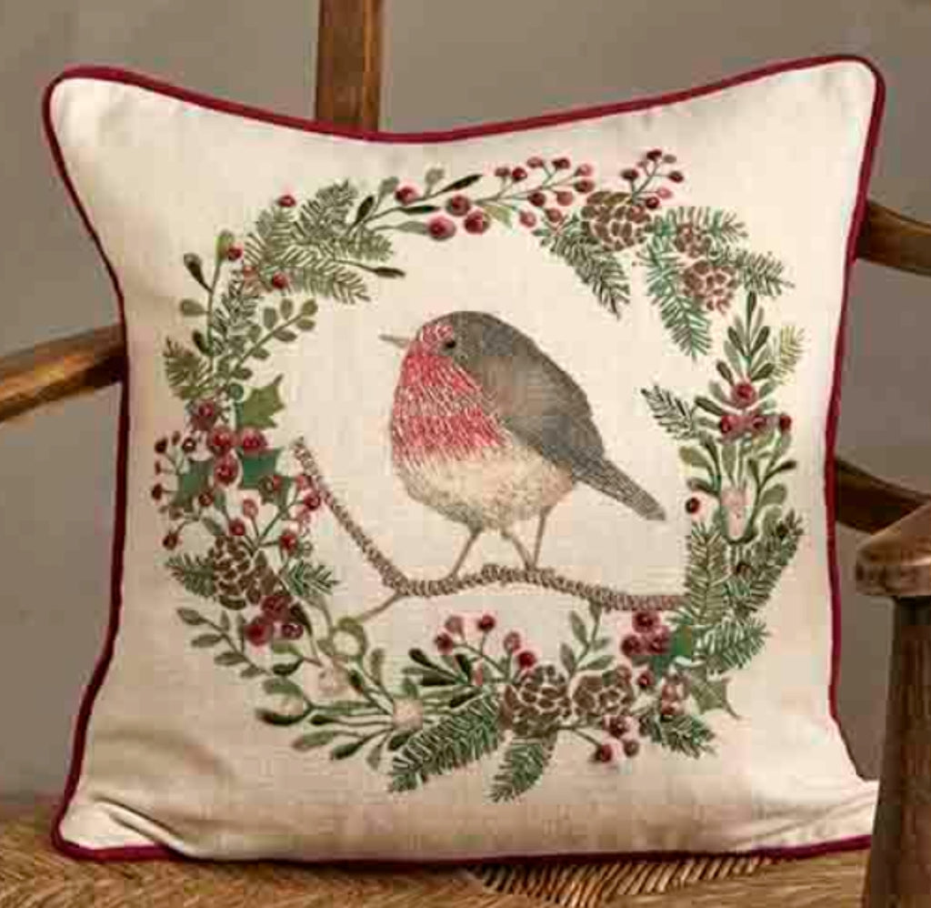 Robin & Wreath Feather Filled Cushion