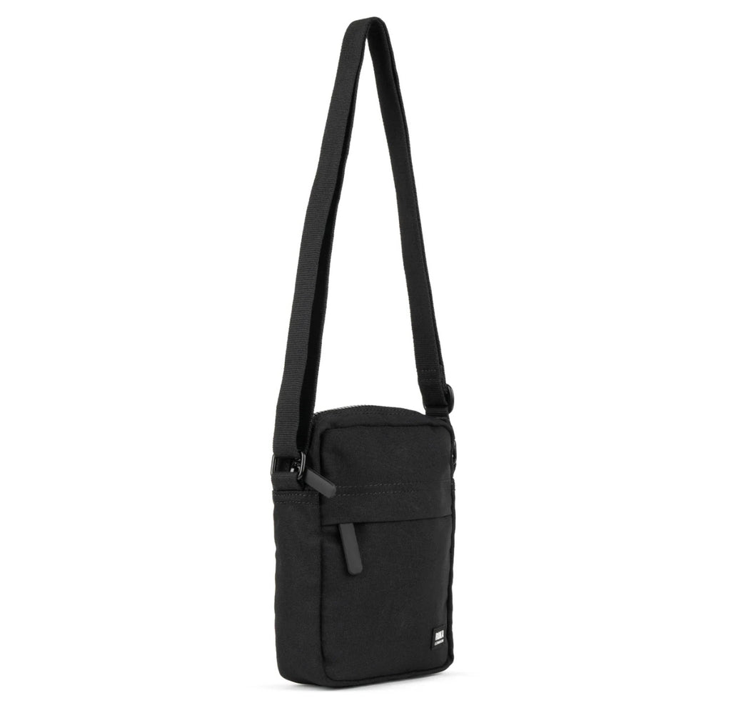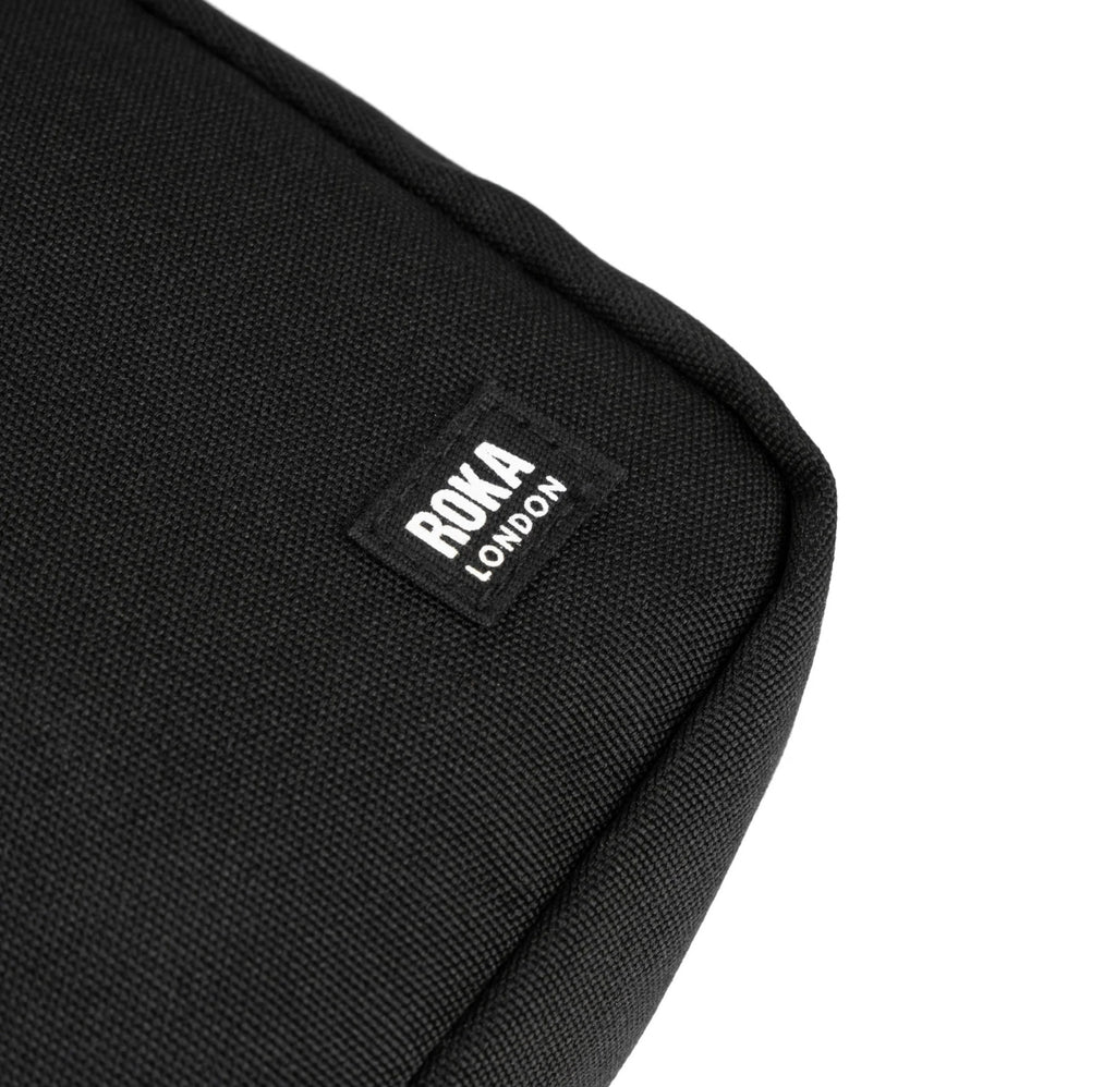 Step into a realm of understated elegance with the All Black from ROKA London. Featuring black labels, straps, rubber zipper pulls, and a captivating black interior, this bag redefines urban chic. Designed with a zip-top closure, an extra external pocket, and an adjustable crossbody strap, it offers a secure and stylish way to carry your essentials - phone, cards, sunglasses, and more. Lightweight and practical, the Bond recycled canvas bag includes a zipped front pocket, open back pocket, and inner mesh compartment, comfortably fitting most phones, even the largest iPhone Max. Elevate your everyday look with this perfect blend of function and sleek style.