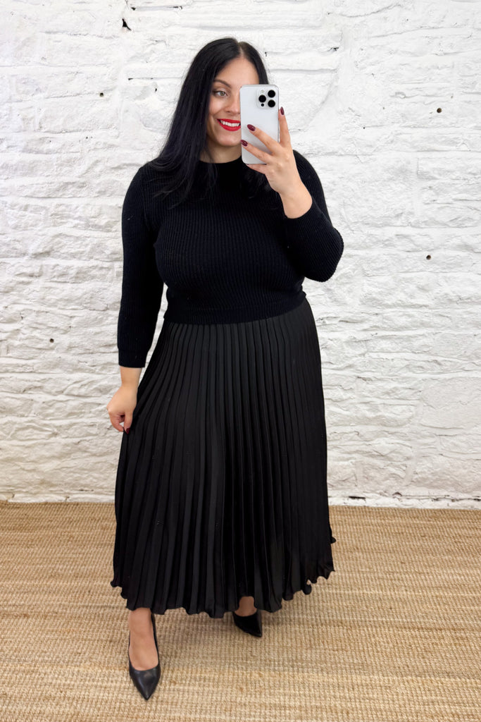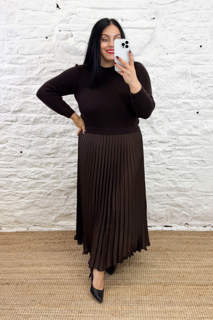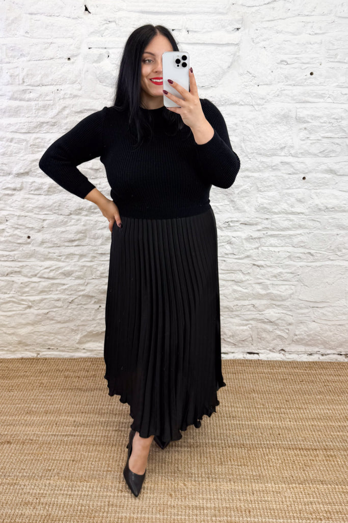 The Roxie Dress effortlessly combines two-in-one styling with a cosy knit jumper top paired with a luxurious pleated skirt in silky satin. The soft, tactile fabric creates an elegant drape that moves beautifully, while the structured pleats add dimension and sophistication. Perfect for transitioning from casual to dressed-up occasions, this piece delivers both comfort and polish in one stunning silhouette.